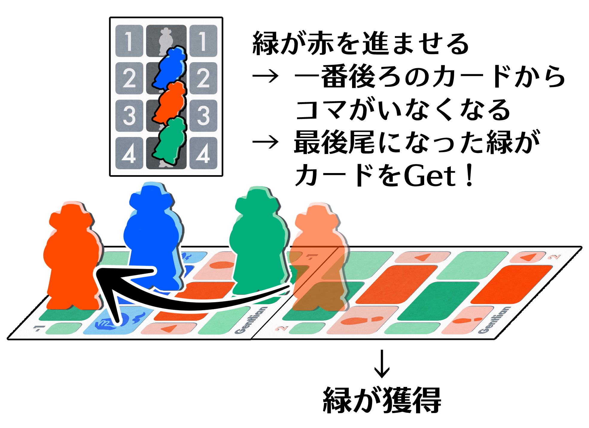 この「最後尾」は移動が終わってから判定するため、自分が後ろから2番目のとき、最後尾のコマを動かして自分を追い抜かさせれば、自分が得点できることもあります。