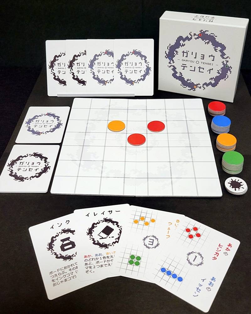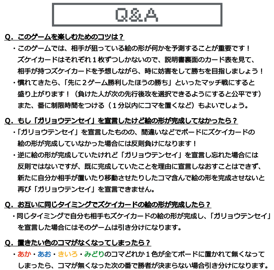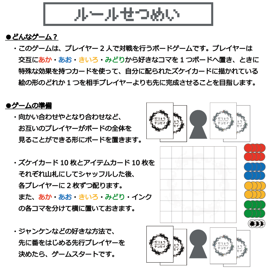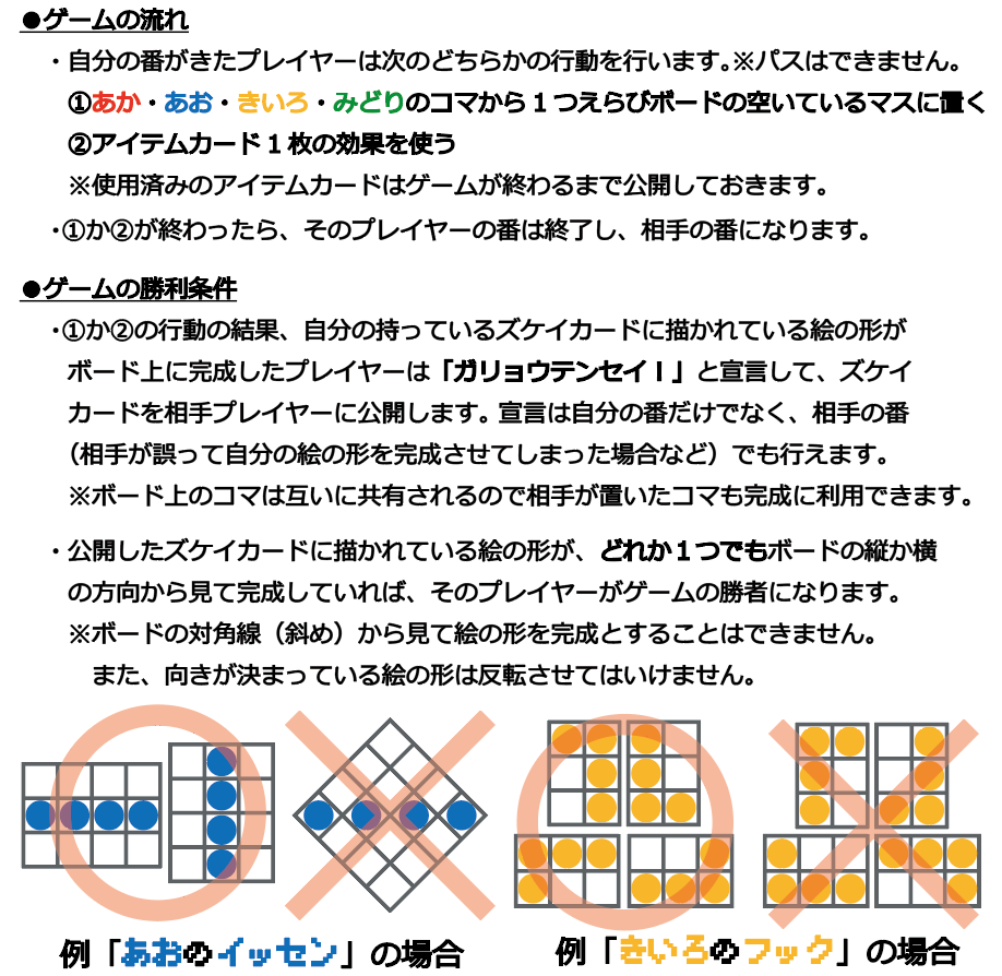 ガリョウテンセイは、五目並べのように1対1で互いにコマをボードへ置いていき、配られた「ズケイカード」に描かれている絵の形を先に完成させたプレイヤー勝利となるボードゲームです。