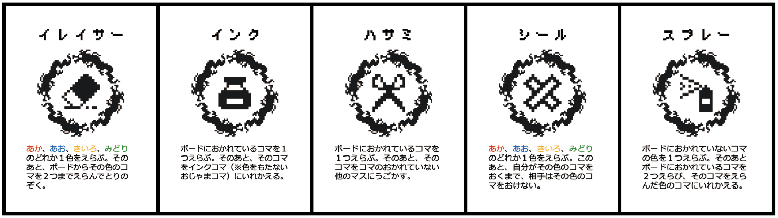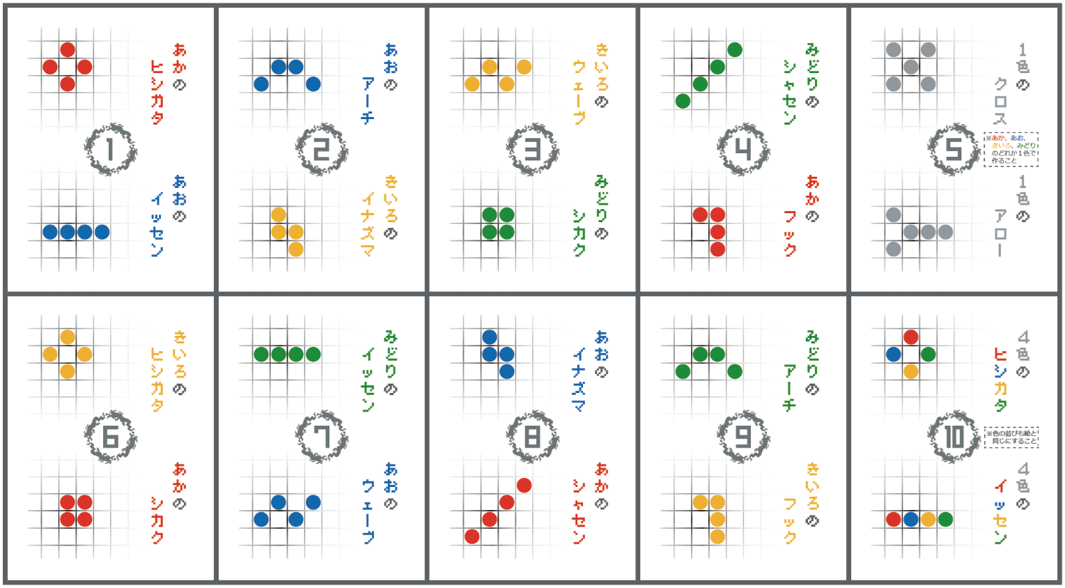 ただ、同じ色の同じ形はなく、カードごとに形の組み合わせも決まっているので、相手がどんなコマを置いたかによって、狙っている形を予想することもできるのです!