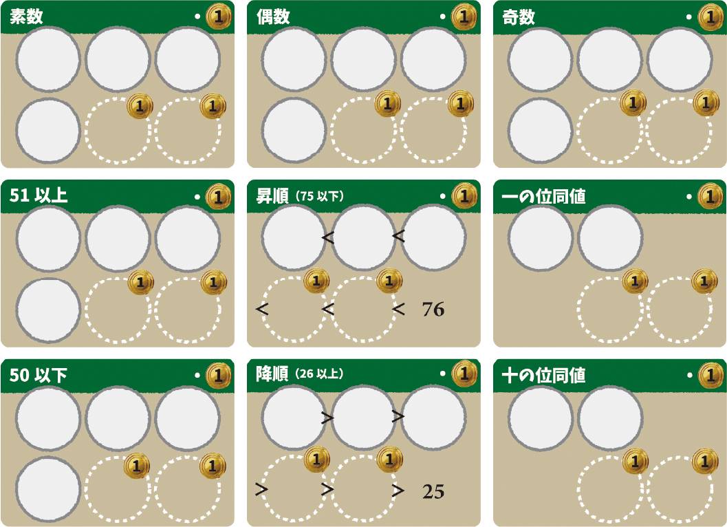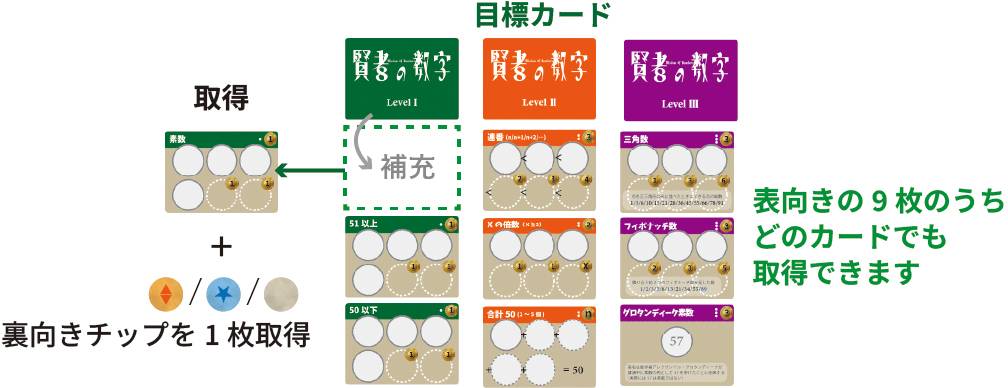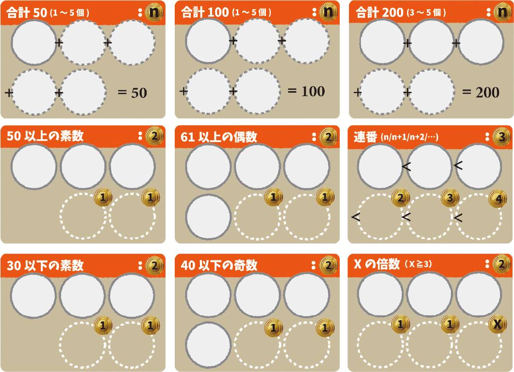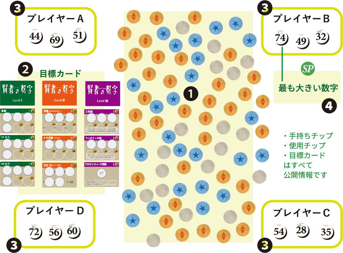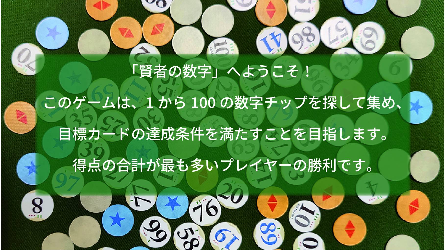 「賢者の数字」は、1から100の数字チップを集め、目標カードの達成条件を満たしていくゲームです 。