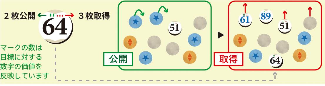 • マーク(公開):マークの数だけ場の裏向きチップを表向きにします 。公開したチップは手番終了後も表向きのまま場に残ります。