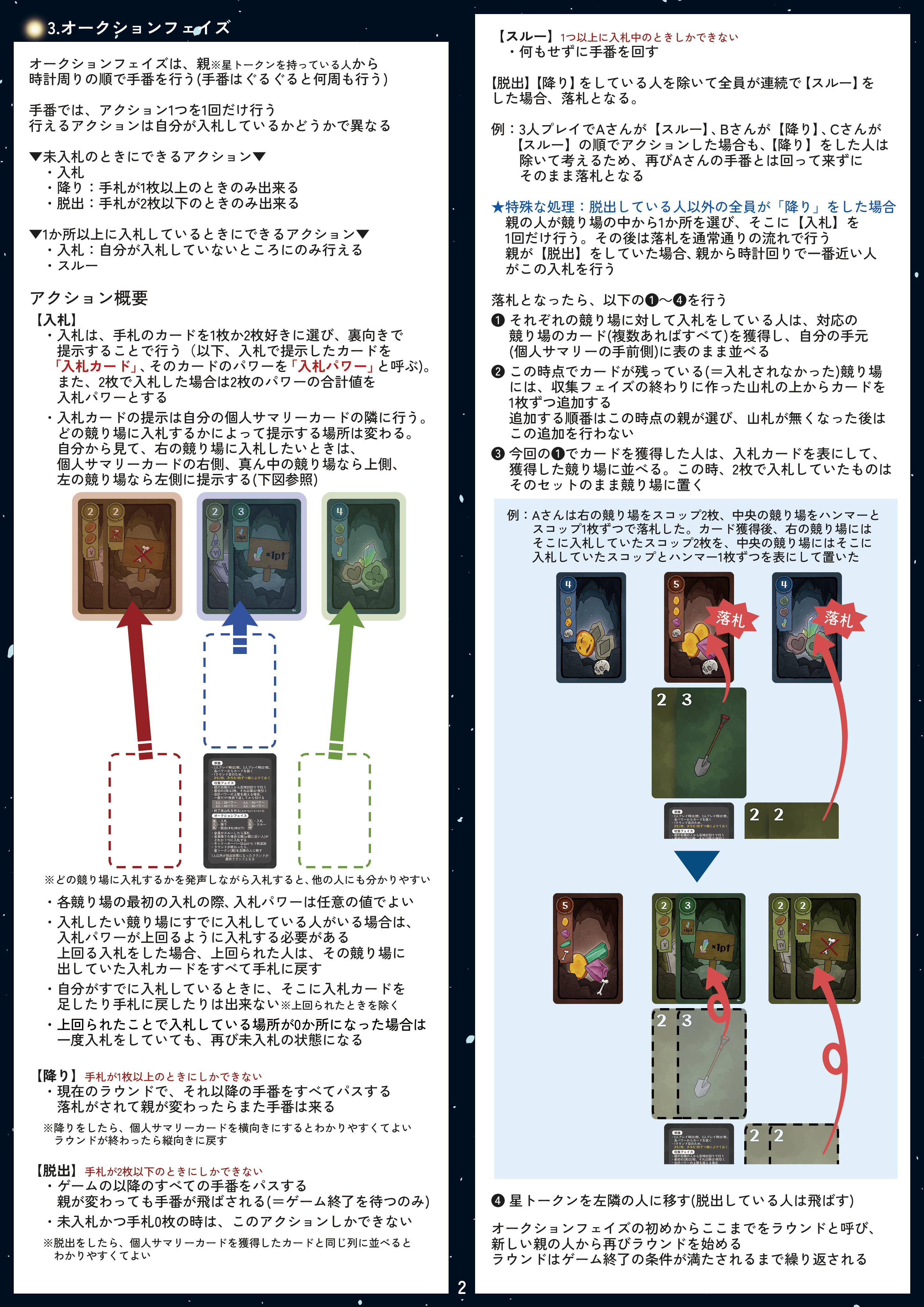 競り落とすことで初めてカードは自分の場に獲得でき、自分の場にあるものだけが自分のお宝となる。(手札は自分のお宝ではない)