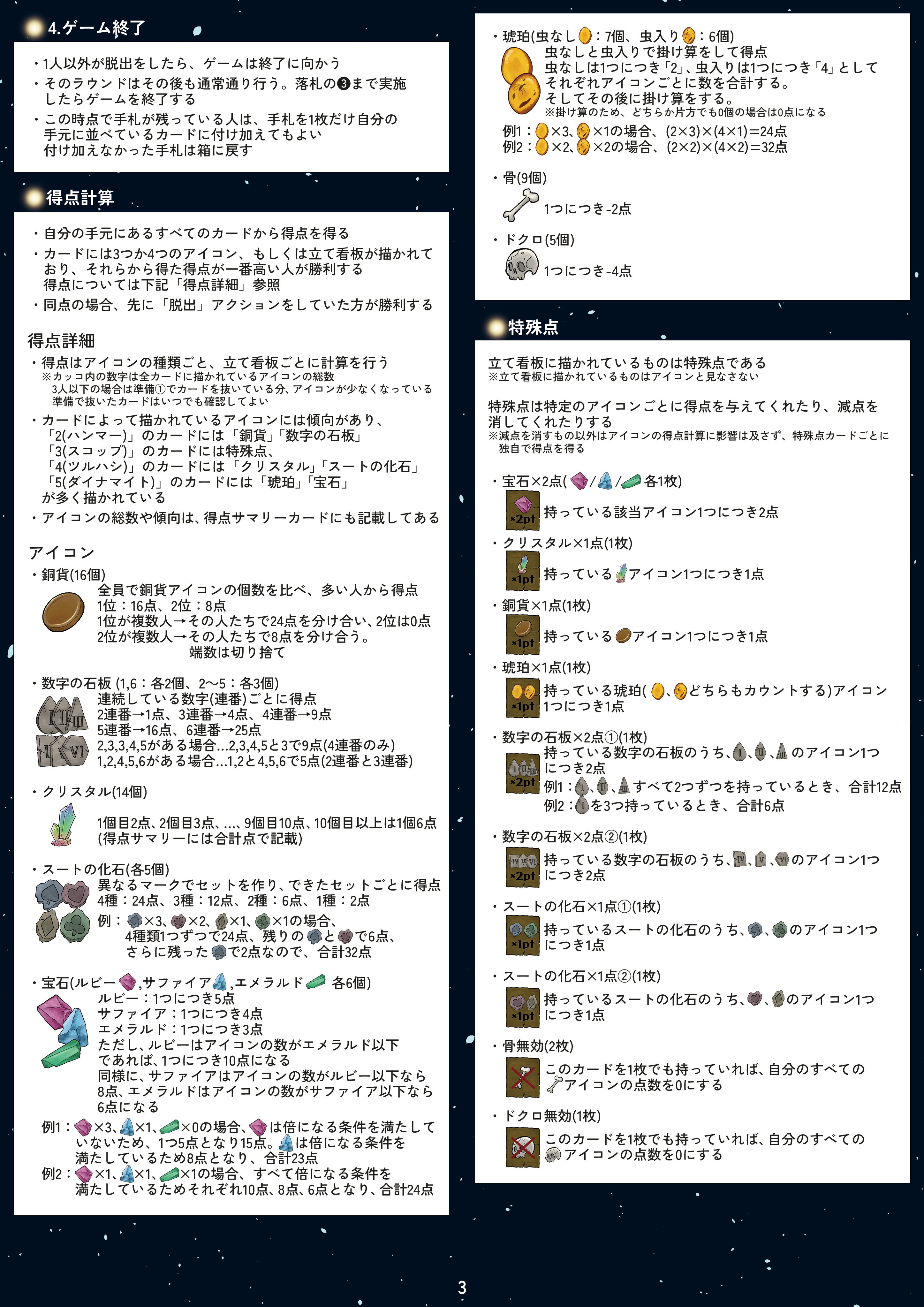 このゲームは宝石や化石をたくさん集めて、自分の獲得したものの価値の合計を他の人よりも高くするゲームです。