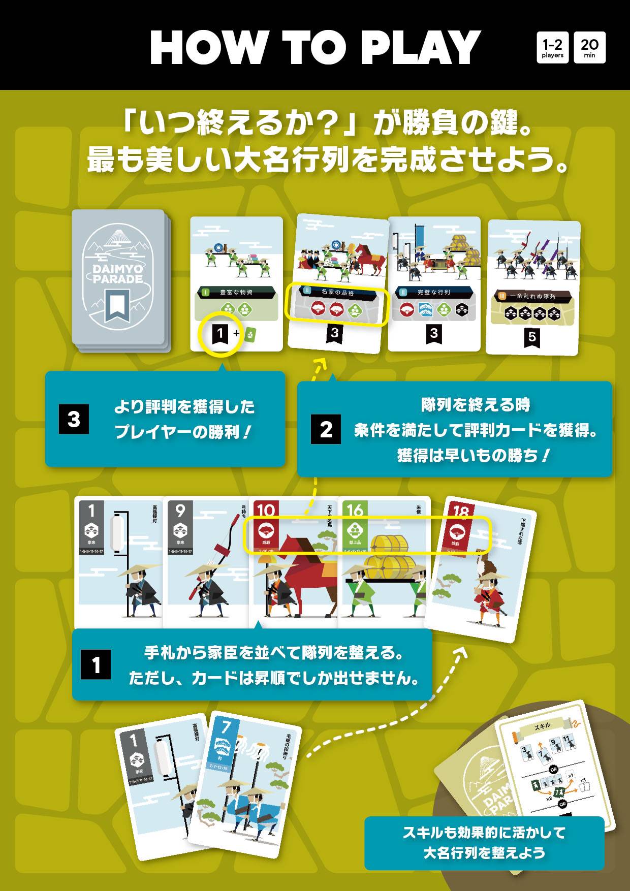 『大名パレード』は、手札の家臣カードを昇順に並べて隊列を作ることで、条件を満たす評判カードを獲得し、勝利点を競うカードゲームです。
