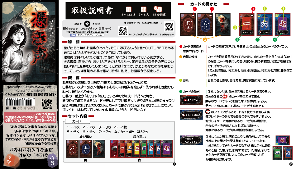 山札から1まいずつ引き、7種類あるお札のうち、4種類を被らずに集められれば脱出し勝利となります。
