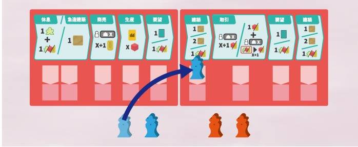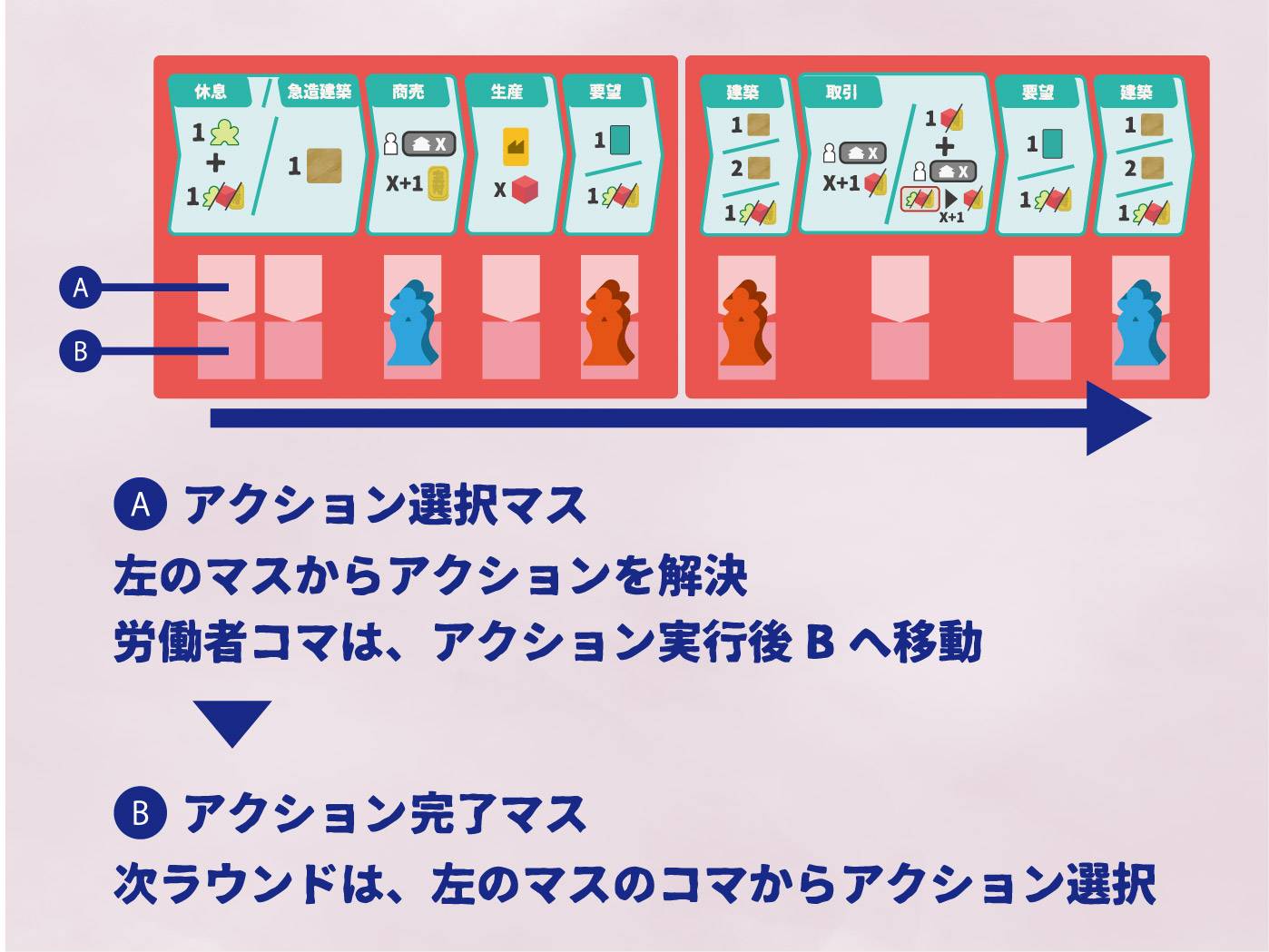 最初のラウンドこそ手番順にアクションを選択していきますが、次ラウンド以降は、前のラウンドでより左側にあるアクションを行った労働者コマから、アクションを選択していきます。