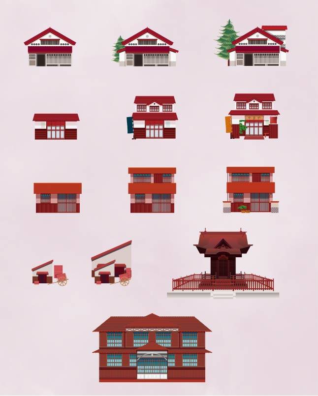 住宅、商店、加工所、館、神社、学校など、舞台とした備中吹屋地区の美しくも懐かしい雰囲気の建物のイメージから、ひとつずつ描き起こしました。