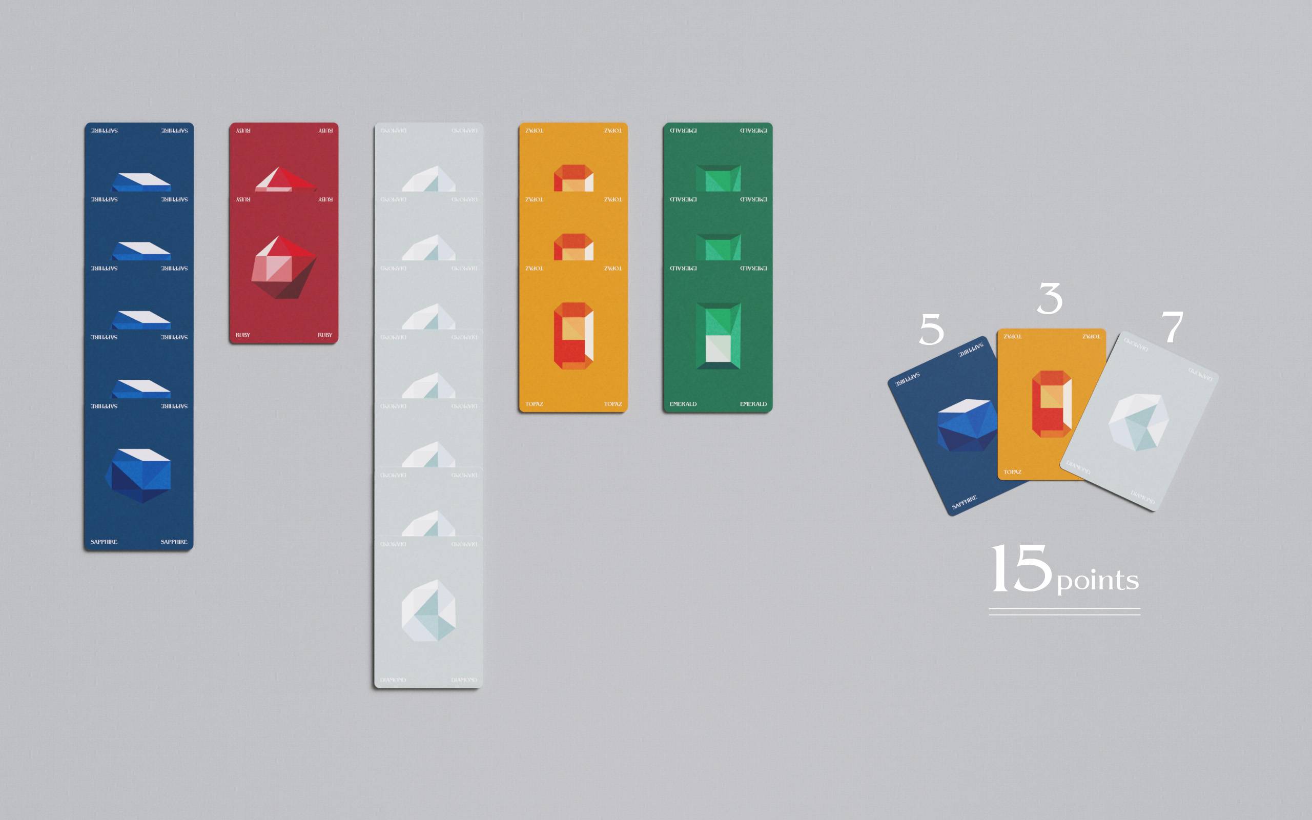 (下記の写真の手札はサファイアが5点、トパーズが3点、ダイヤモンドが7点となり、合計15点です)