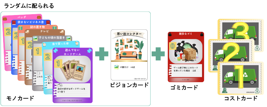 プレイヤーは「ゴミカード」と「コストカード(1/2/3)」をそれぞれ1枚ずつ、更に「モノカード」6枚と「ビジョンカード」が3枚配られます。