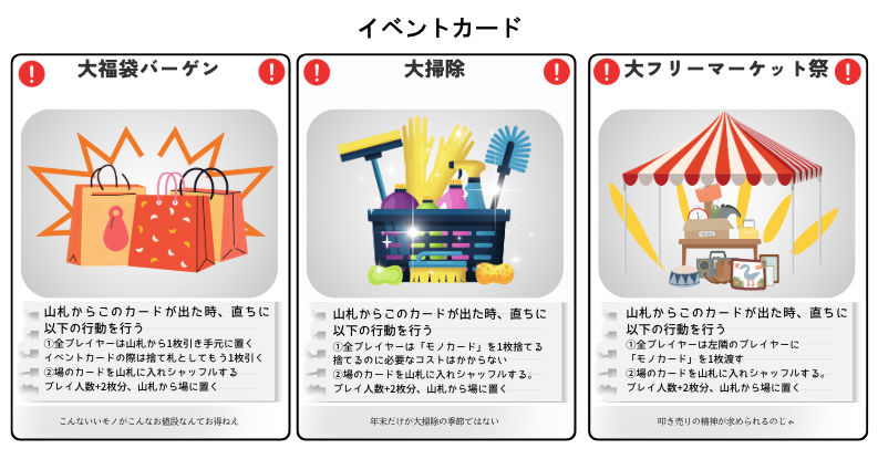 最後に山札から引かれたらすぐさま効果が発動する3枚の「イベントカード」を仕込んでゲームスタートです!