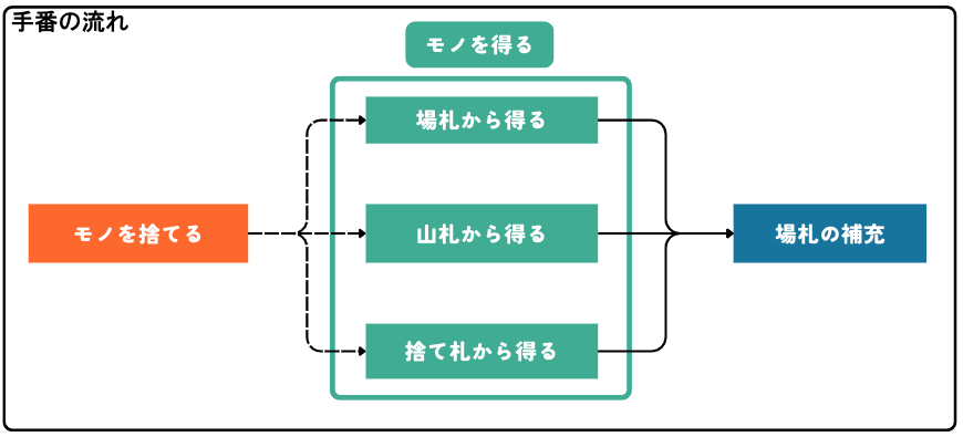手番で行う モノを捨てる → モノを得る がそのままです。