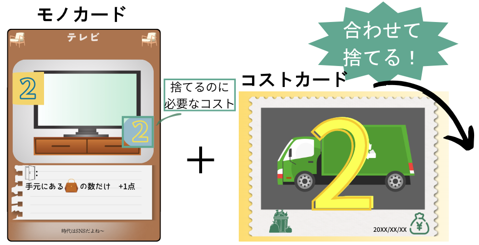 捨てた「モノカード」に捨てるのに必要なコストがない場合でも「コストカード」を支払い、取得できるコストの合計値を上げることができます。