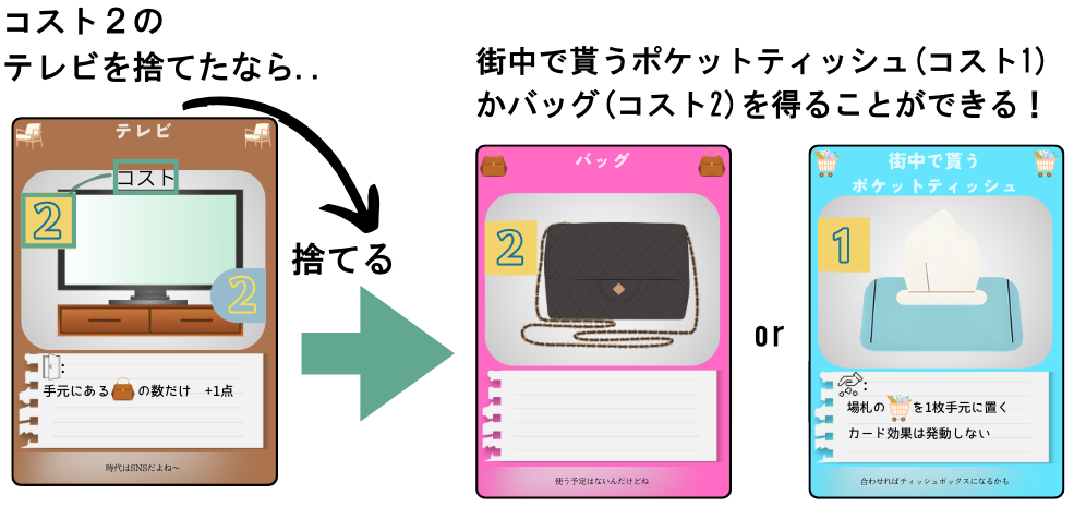 コスト2の「テレビ」を捨てたのであれば、「街中で貰うポケットティッシュ」(コスト1) か 「バッグ」(コスト2) を得ることができます。
