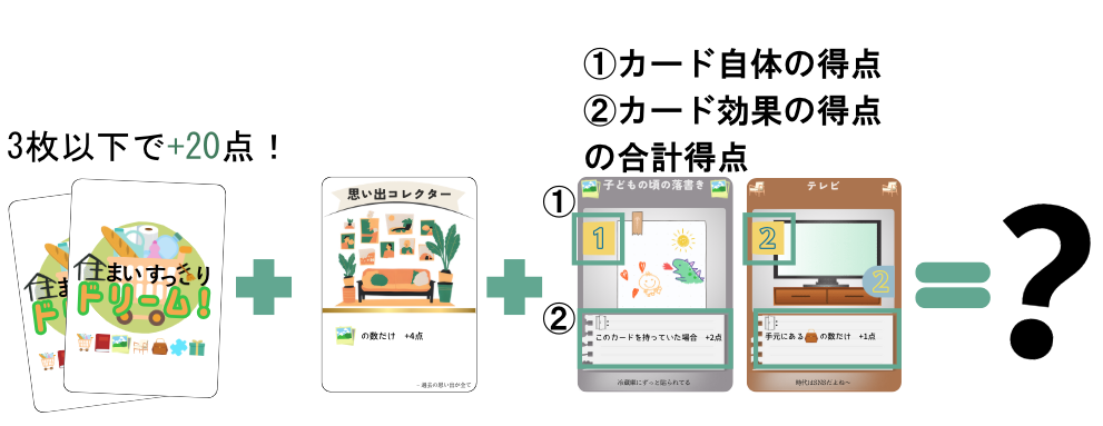 「ビジョンカード」が「思い出コレクター」(カード種類が「思い出」の数だけ+4点される)で手元のカードが「子どもの頃の落書き」と「テレビ」だった場合、得点は以下のようになります。