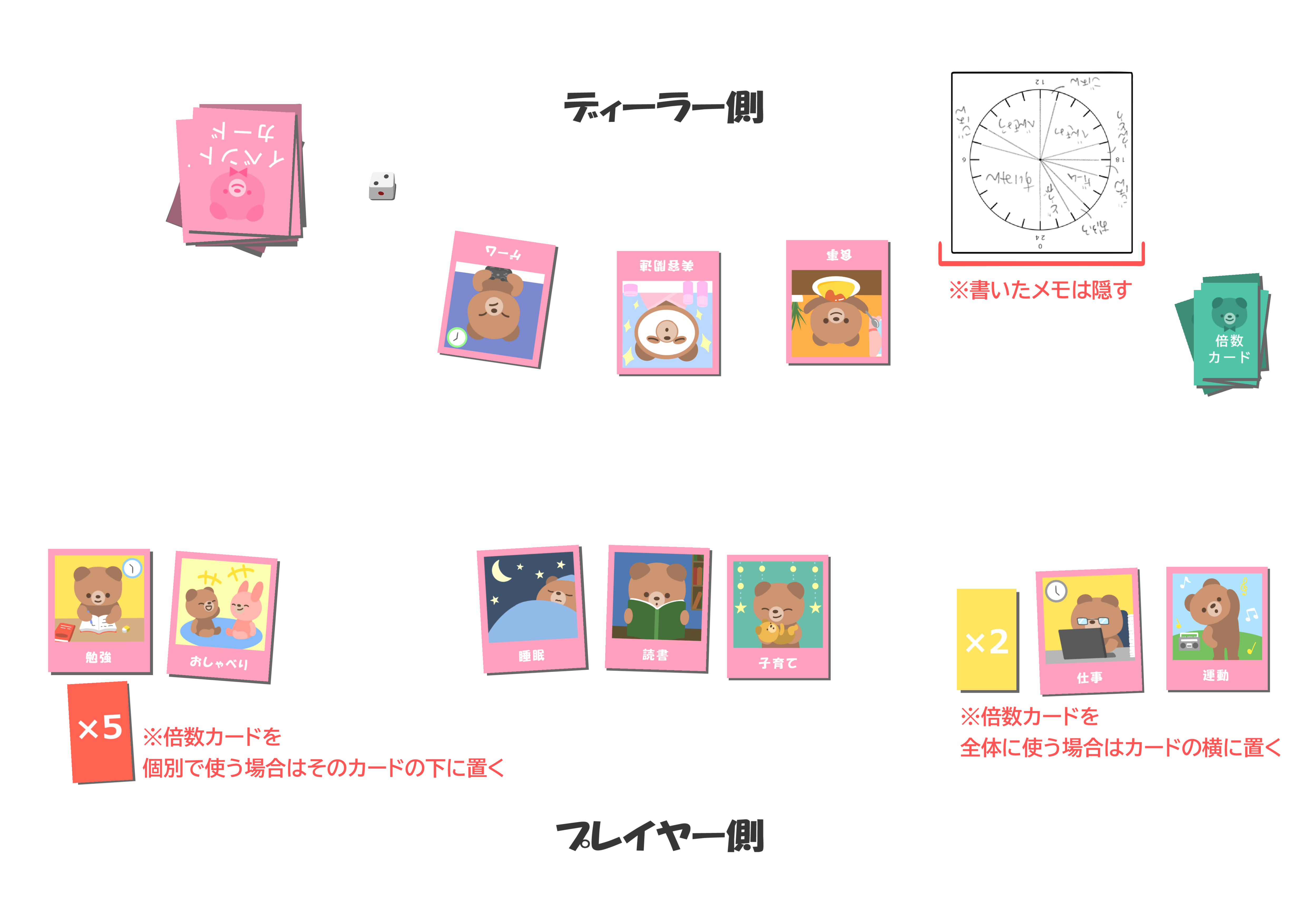 ⑤全プレイヤーが倍数カードの用途を確定し、所定の位置にを設置したら、その旨をディーラー役に伝える