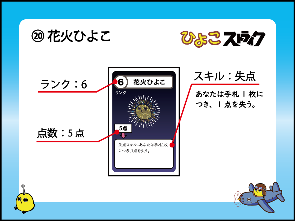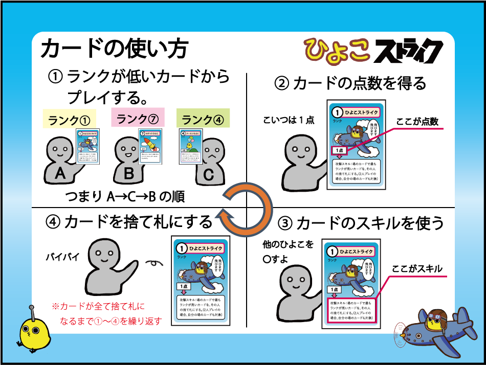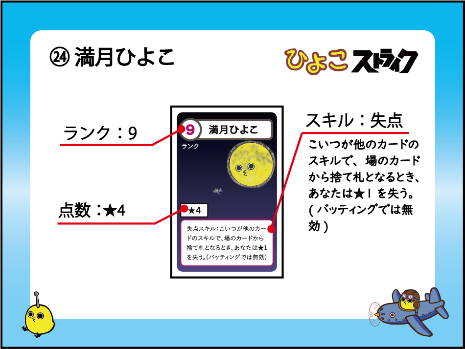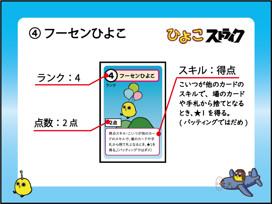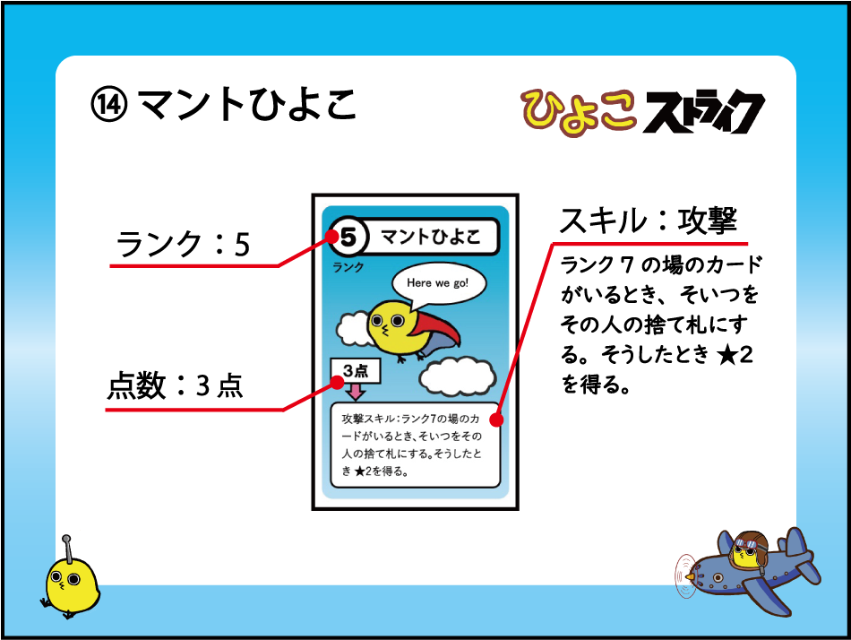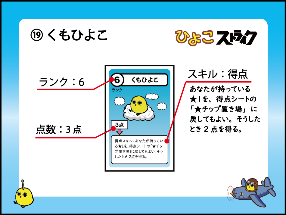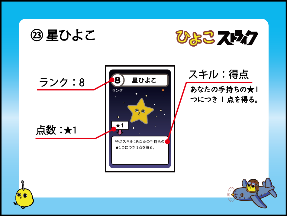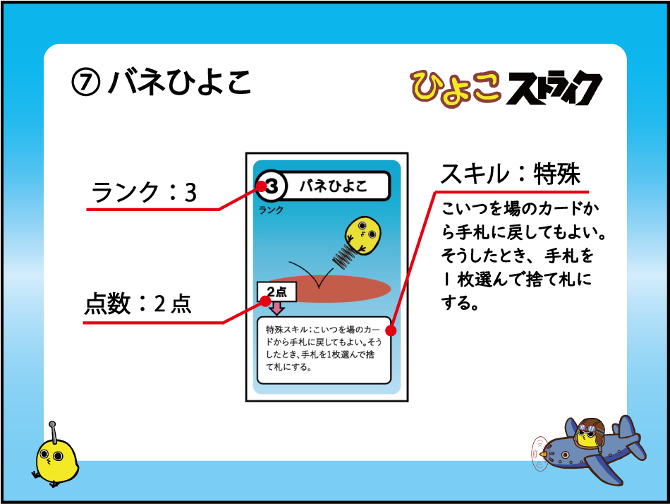 スキルの使用条件に「ランク7の場のカード」とあるけど、要は「ロケットひよこ」が出ていればそいつを捨て札にして、★チップが2枚もらえるよ。