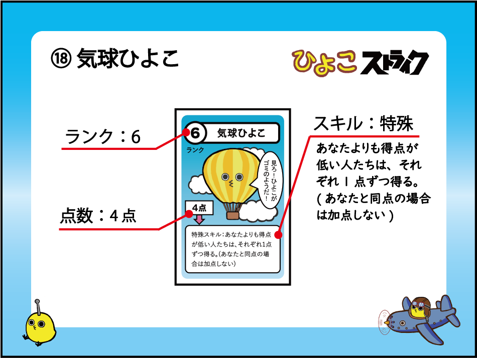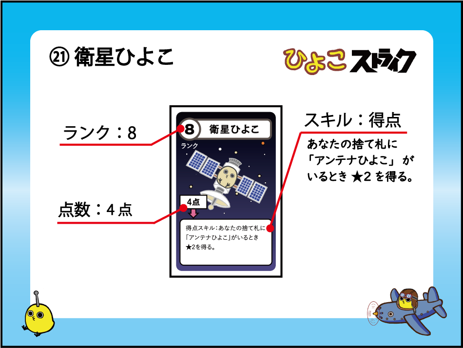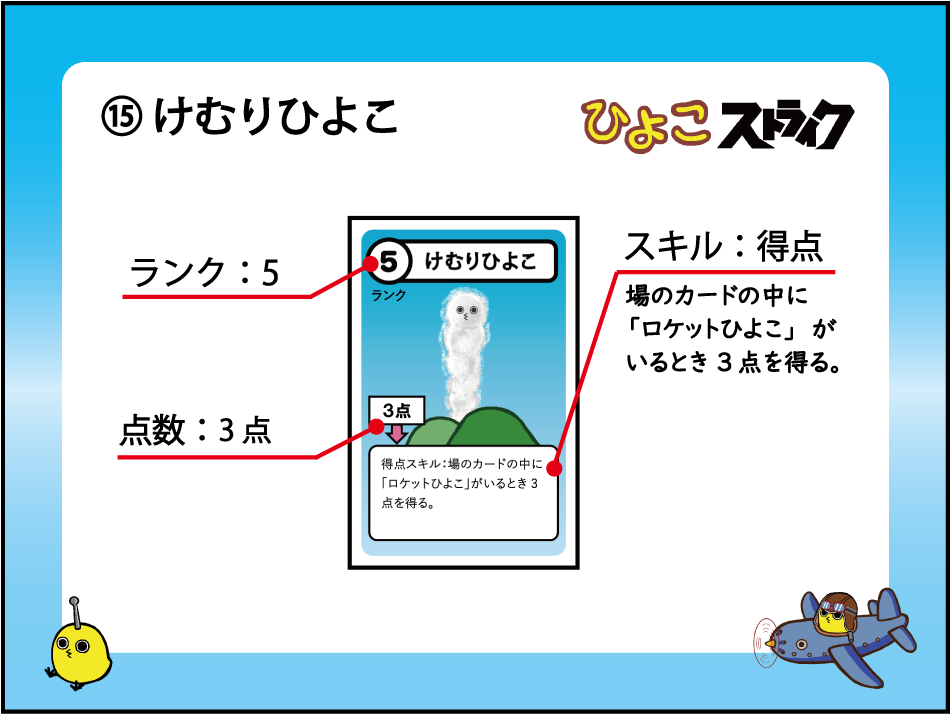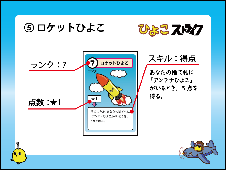 例えば「ロケットひよこ」が出ていたら、そのスキルを選んで5点がもらえるよ。ただし、自分の捨て札に「アンテナひよこ」がいないとダメだけどね。