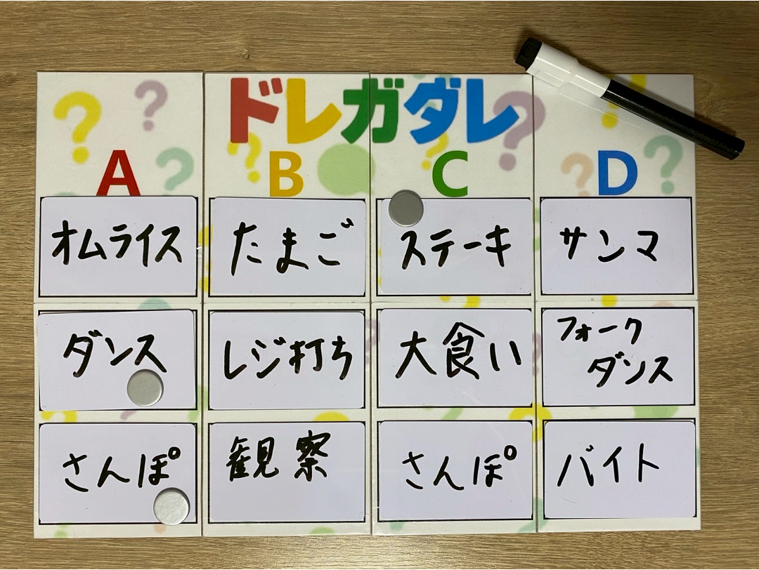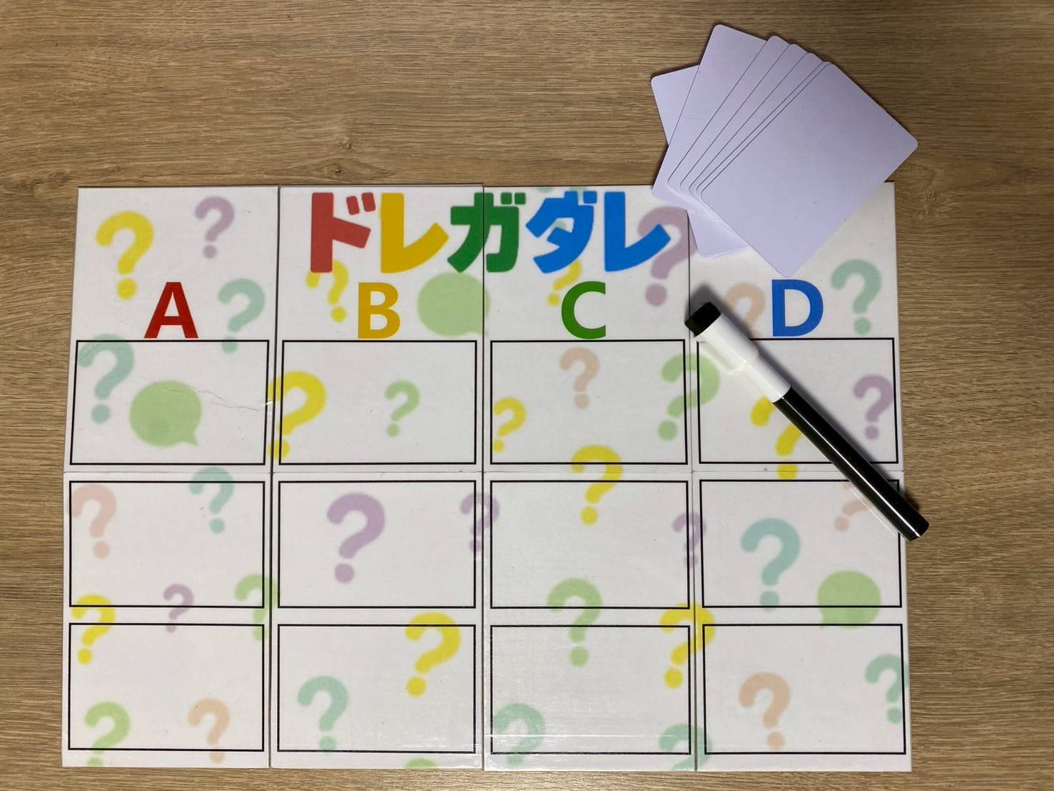 3 質問者にアルファベットが書かれた記号カードを配ります。今後、質問者は自分のアルファベットの場所に"匿名"で回答を並べていきます。
