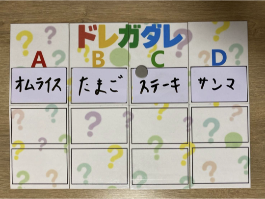 (上の図の場合、「好きな食べ物は?」という質問。質問ごとに、質問者は一番ターゲットぽい回答にチップをおきます。チップを置いてもらったプレイヤーは得点が入るので1回の質問ごとに気合が入ります!)