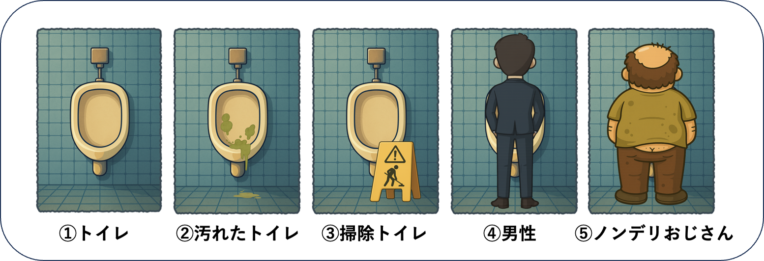①トイレカードの上に出せるもの→④男性、⑤ノンデリおじさん