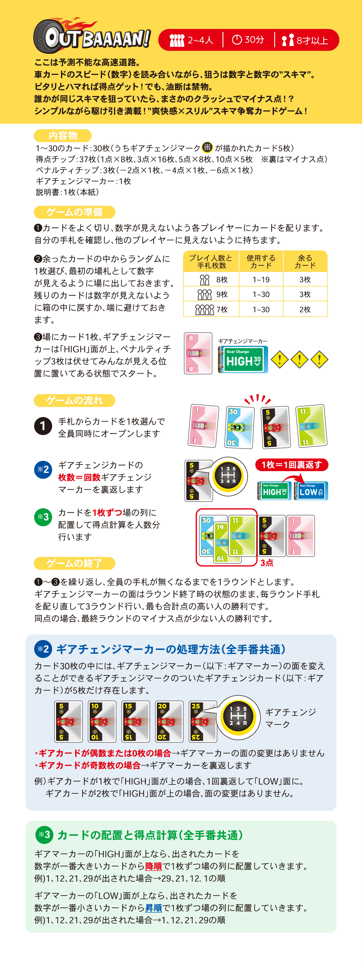 - 「OUTBAAAAN!」ここは予測不能な高速道路。車カードのスピード(数字)を読み合いながら、狙うは数字と数字の“スキマ”。ピタリとハマれば得点ゲット!でも、油断は禁物。誰かが同じスキマを狙っていたら、まさかのクラッシュでマイナス点⁉シンプルながら駆け引き満載!“爽快感×スリル”スキマ争奪カードゲーム!