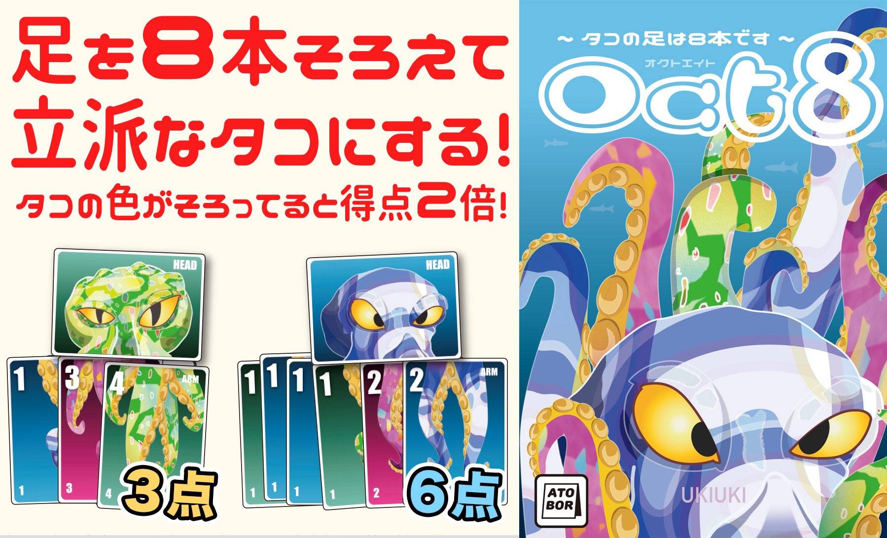 『Oct8(オクトエイト)』は、プレイヤーが「タコ創造の主」となり、退屈した神々のための遊びとして最高のタコを創り出すことを目指すカードゲームです。