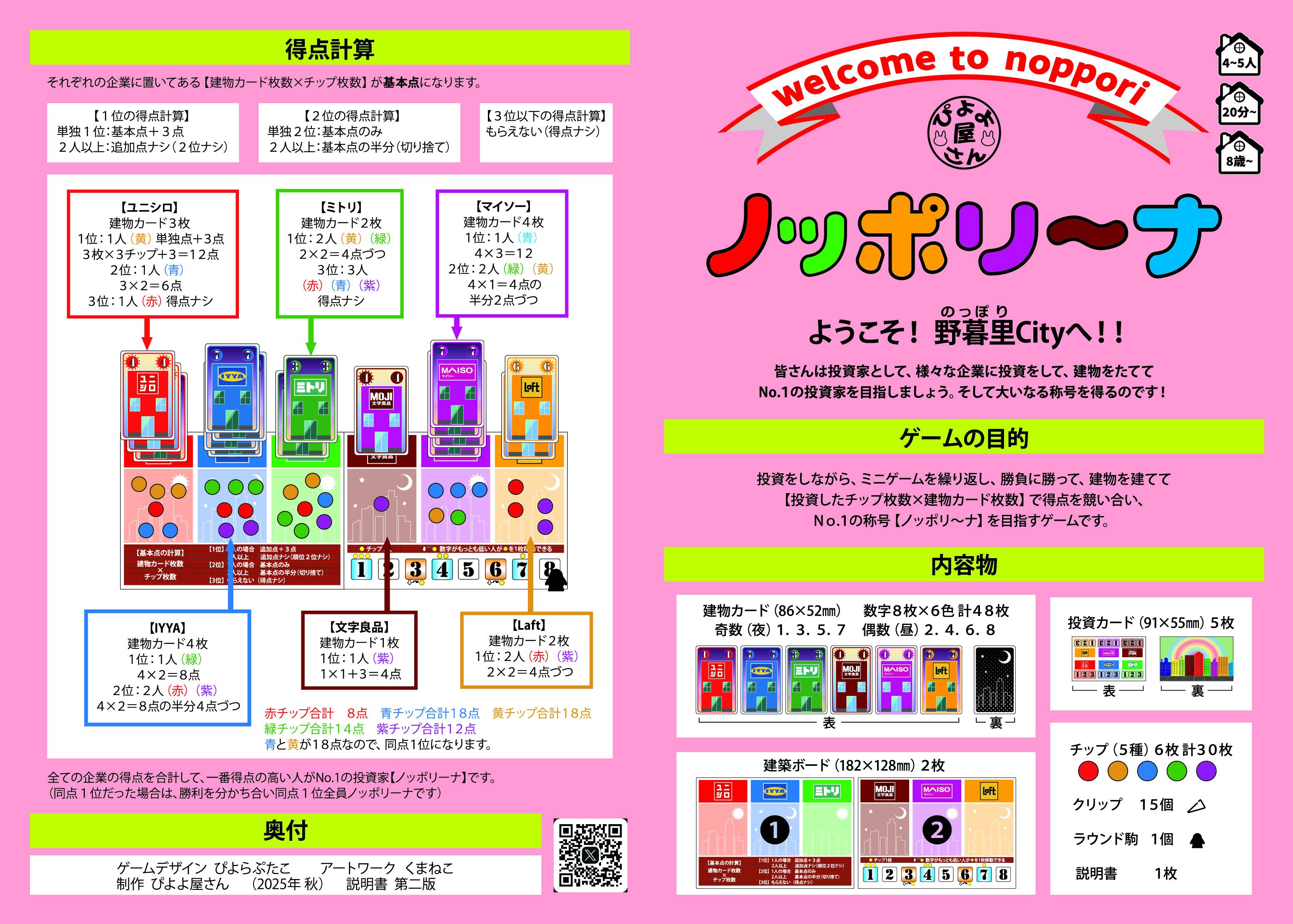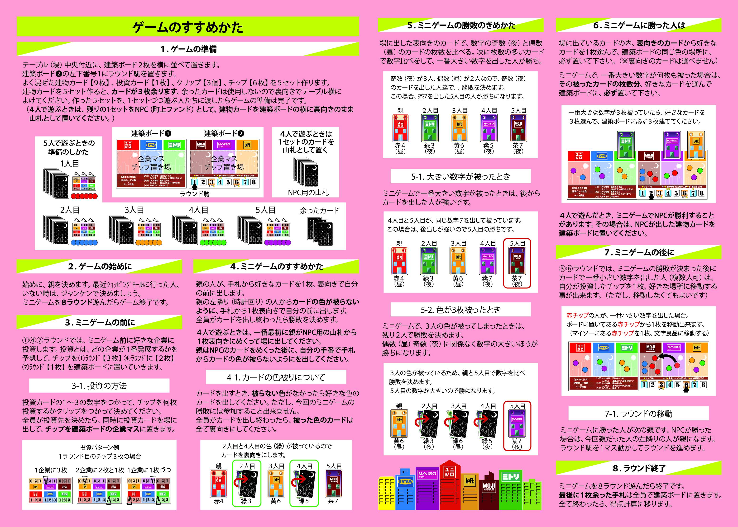 - 野暮里で投資家になり、ミニゲームを8回繰り返して(どこかで見たことのある)建物を建てて、建物枚数×投資したチップ数で点数を競うあうゲームです。