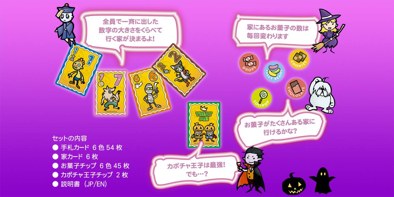 Trick or Treaters Plus(トリック・オア・トリーターズ・プラス)は、以前に作製した4人用ハロウィンゲームを、6人プレイ対応にリニューアルしたカードゲームです。