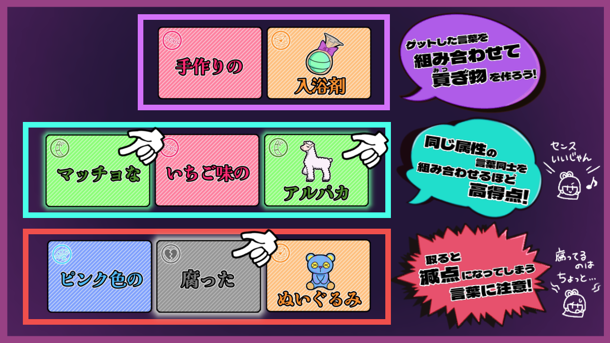 ②これを数回繰り返し、ゲットした言葉を組み合わせてより良い"貢ぎ物"を作ろう!