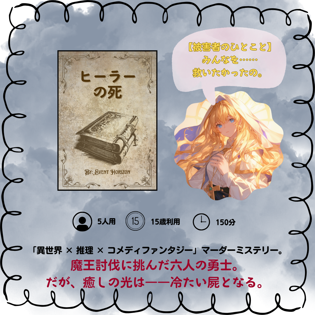 - 魔王討伐に集いし六人の勇士。 聖所を守る治癒の光――テレサ。 片手に怪力を宿す勇者――ジョンイ。 魔力を操る賢者――セラ。 百発百中の弓手、森の民――エリス。 闇に紛れ刃を走らせる盗賊――ブラック・ファイア・ドラゴン。 そして――全ての荷を背負う男、 荷運び――ドゥシク。 魔王城に最も近き地、イフォリウム。 明日訪れる決戦を前に、六人は短き夜を過ごす。 しかし夜明け、 癒しの光は消えた。 ヒーラー、テレサ―― 冷たき骸として発見される。