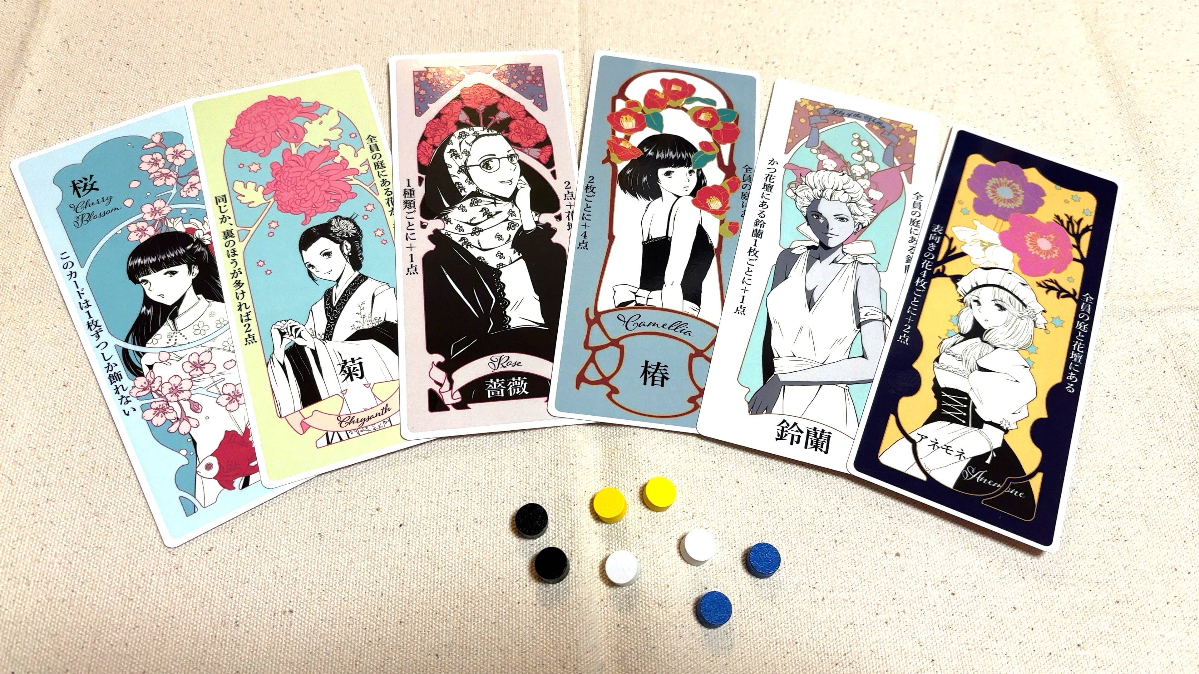 花カードには「菊」「椿」「鈴蘭」「薔薇」「アネモネ」「桜」の6種類があり、花壇に飾ったときの点数がそれぞれ異なります。花の点数はたとえば「全員の庭にある花が、表のほうが多ければ7点、それ以外は2点」「全員の庭と花壇にある、すべての表向きの花4枚ごとに+2点」のように、プレイヤー全員の庭や花壇によって得点が変わります。高得点のためには、自分の庭だけでなく、全員が何を出しているかを鋭くチェックする必要があるでしょう。