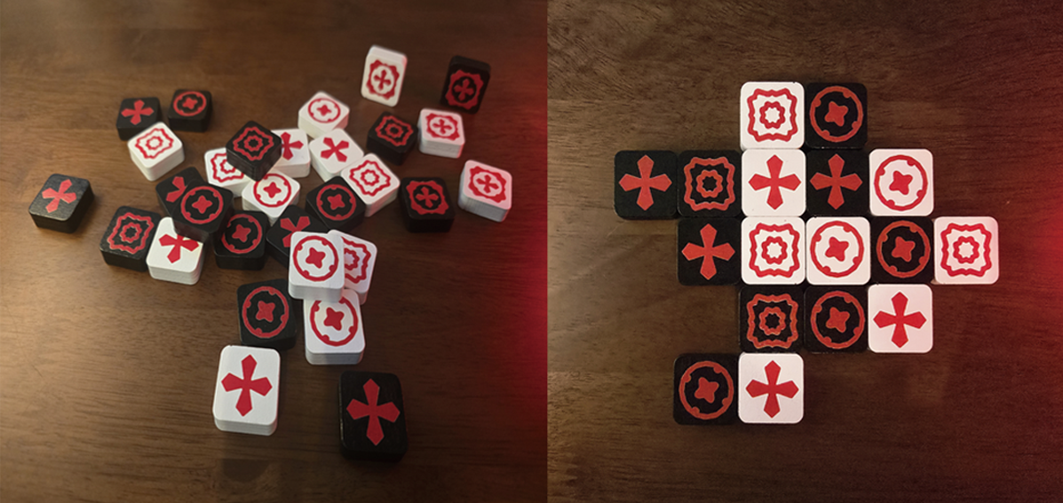 - 両面タイルを使用し、交互にタイルを置くか裏返していき、同じ模様を4つ繋げると勝利となります。