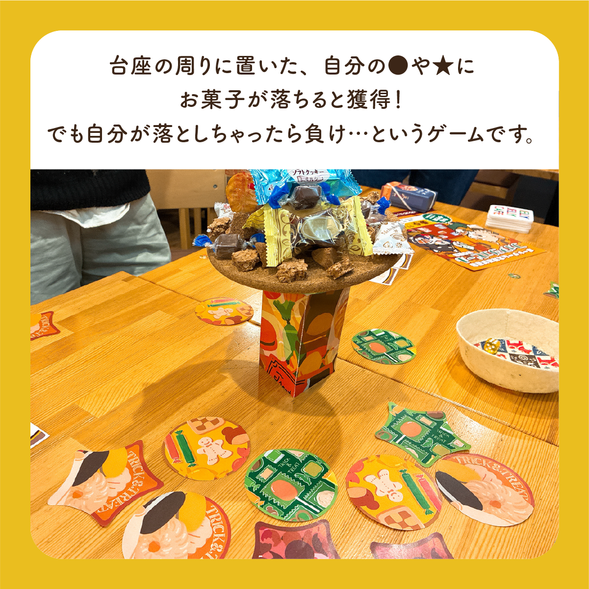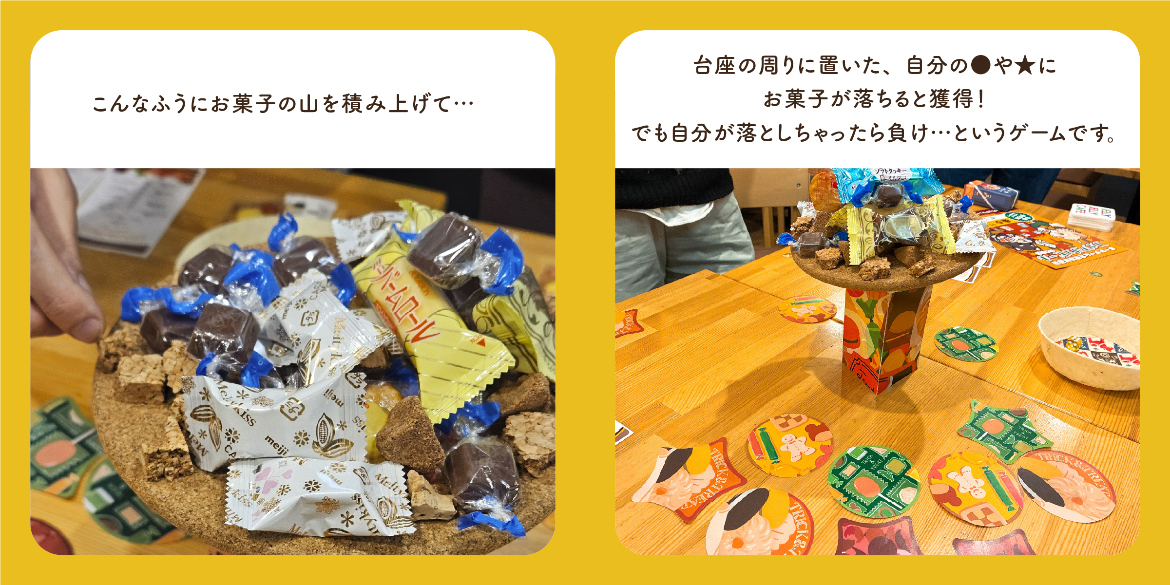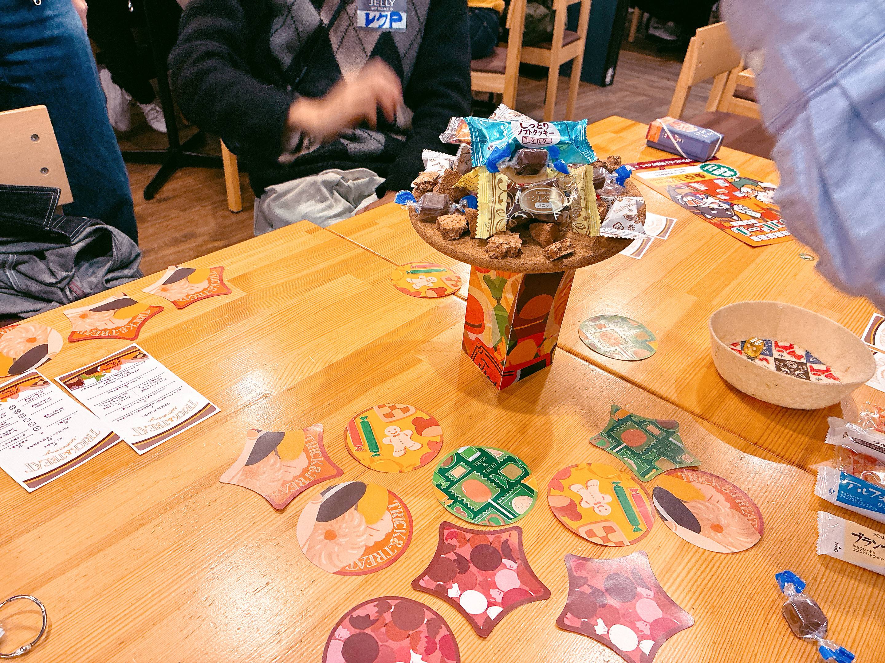 ▽ジェリジェリ渋谷宮益坂店さまの試遊会であそんだ時の様子。中央にお菓子の山ができています。