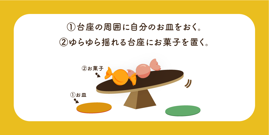 ①ゆらゆら揺れる台座の周囲に、自分のお皿を置く。