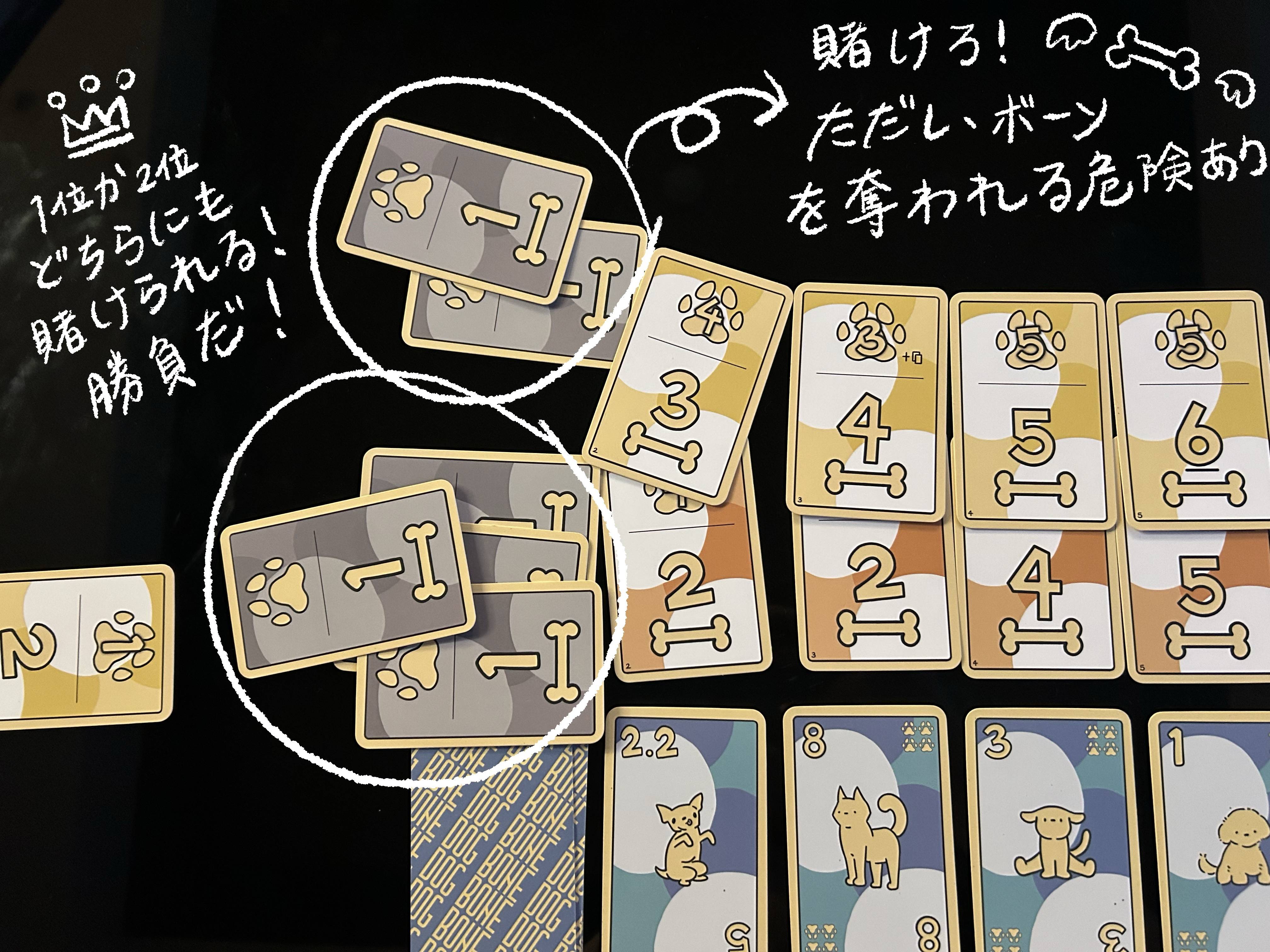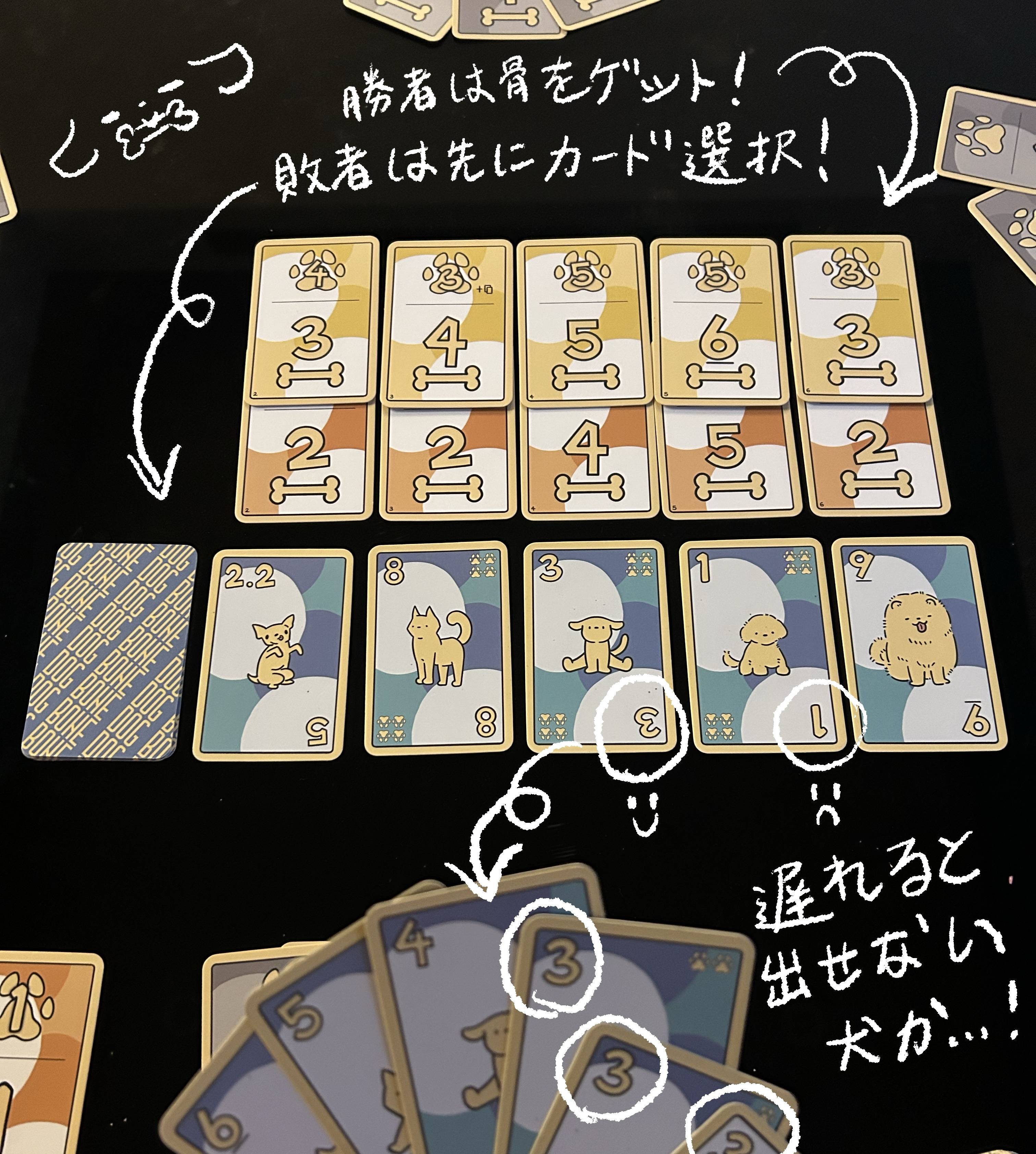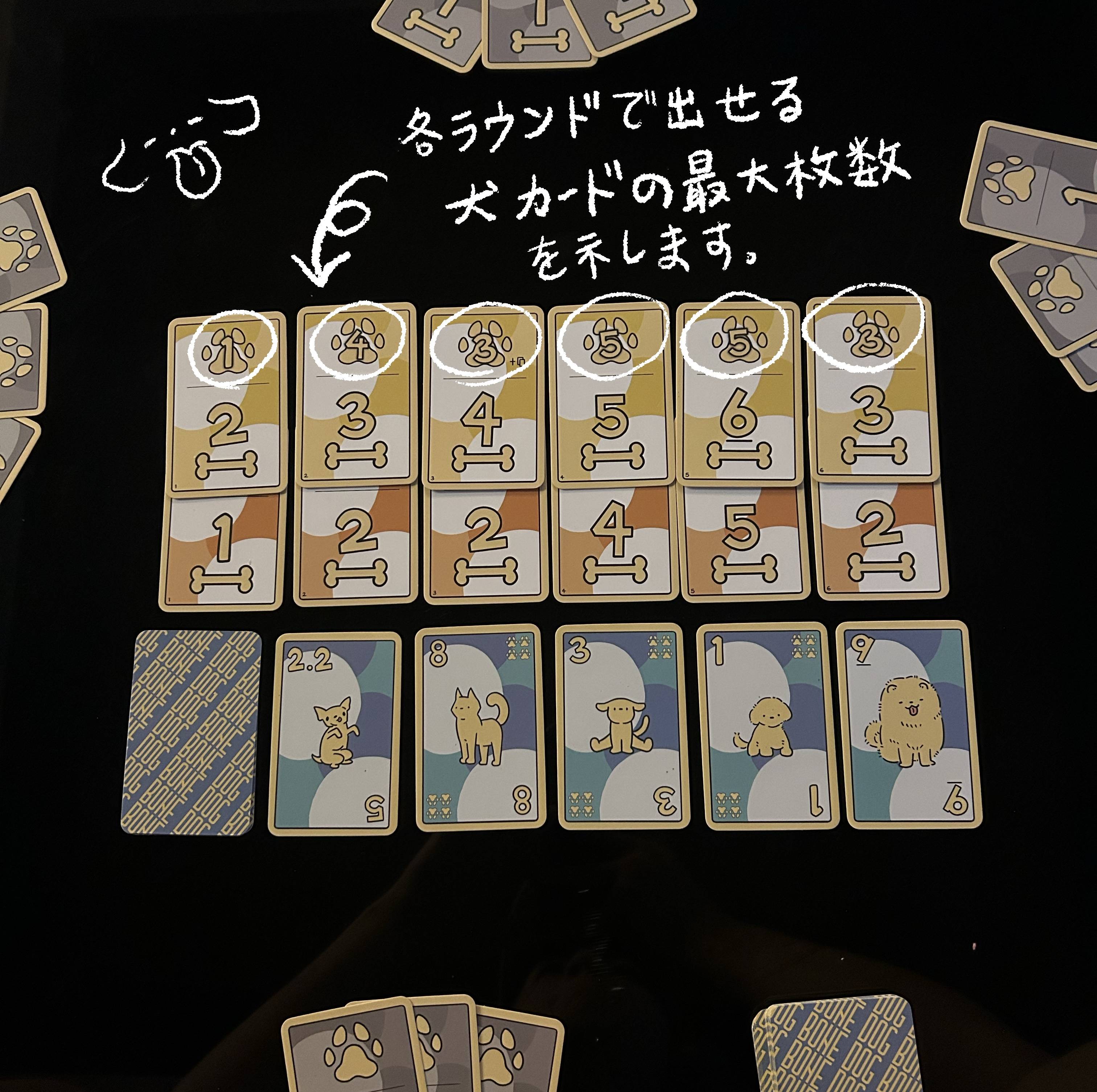 「わんわん!犬骨争奪戦」は、6ラウンドの「トリックテイキングゲーム」形式で進行する小型カードゲームですが、「クライミングゲーム(大富豪)」のカードの組み合わせを使います。
