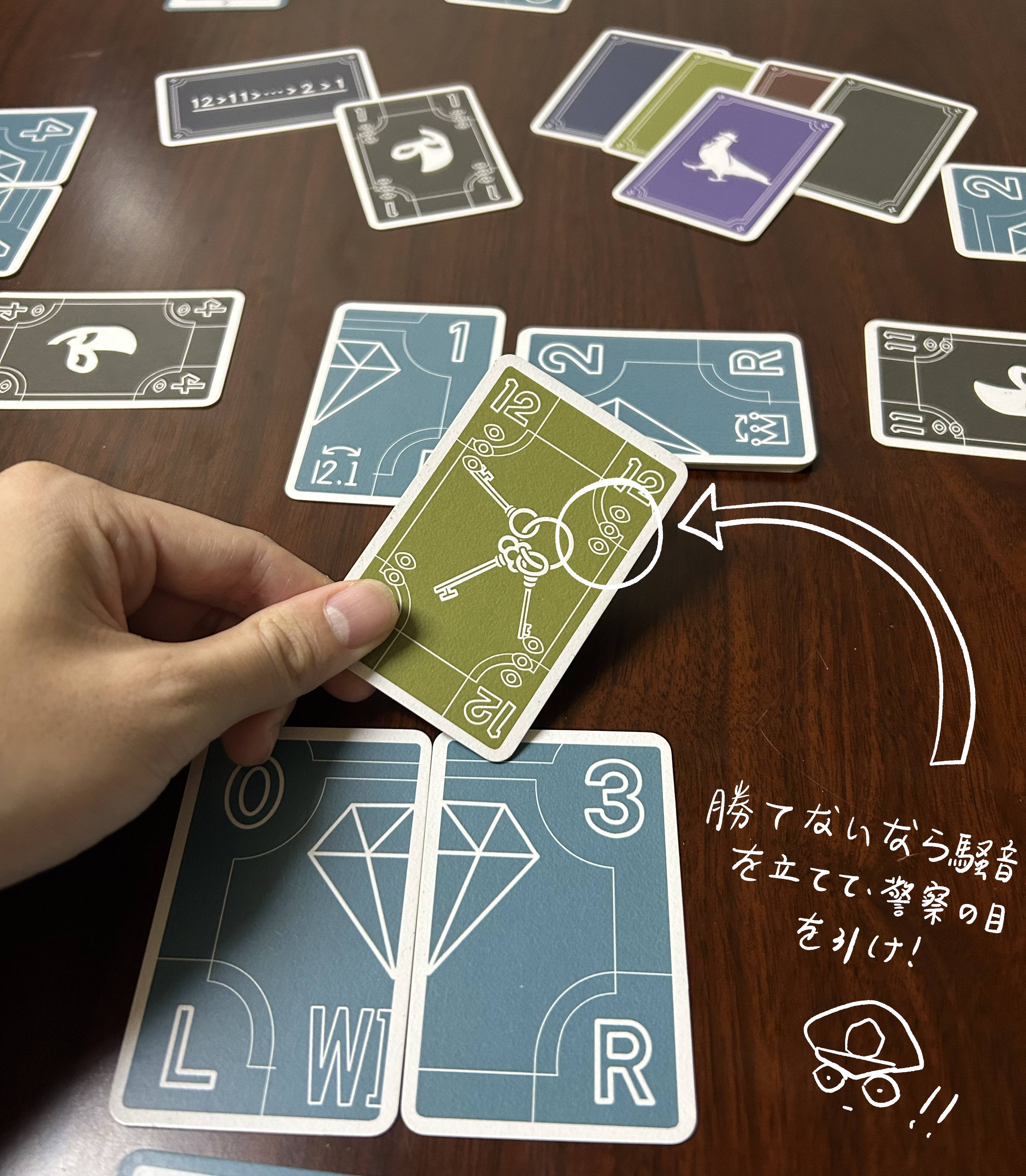 怪盗であるプレイヤーがトリックを取ると、そのラウンドのダイヤモンドカードを手に入れられますが、同時に警察からの注目も集まってしまいます。