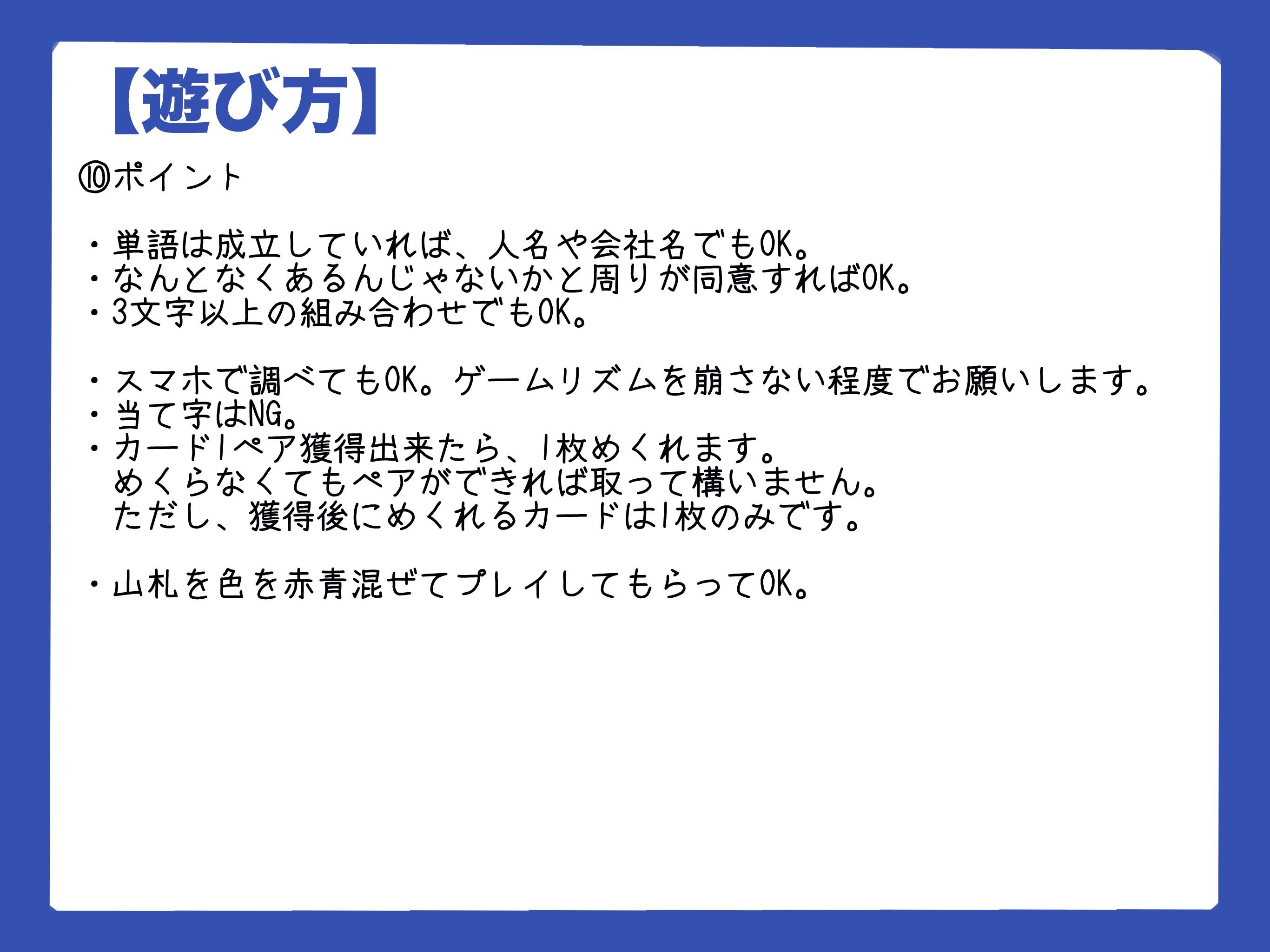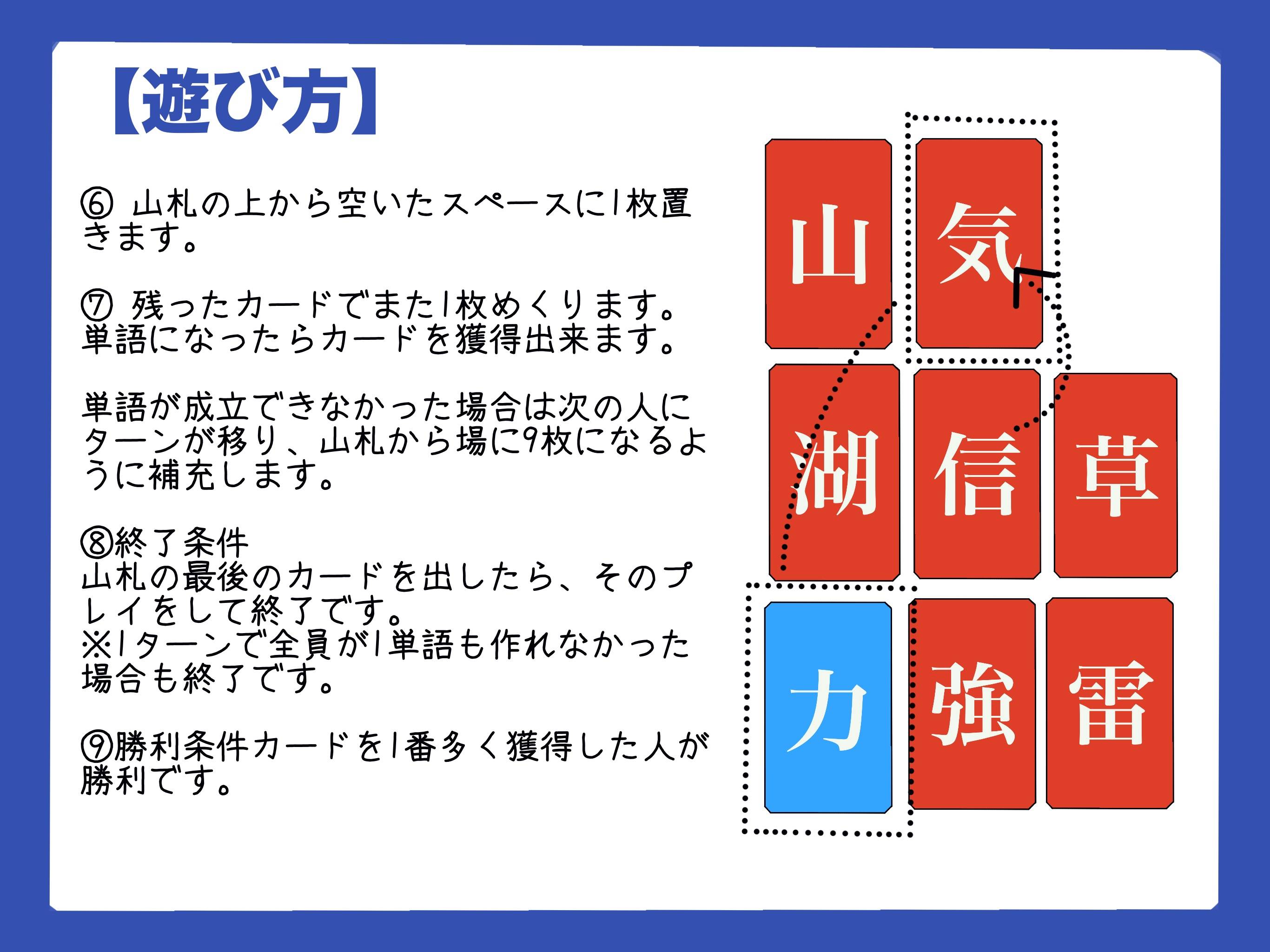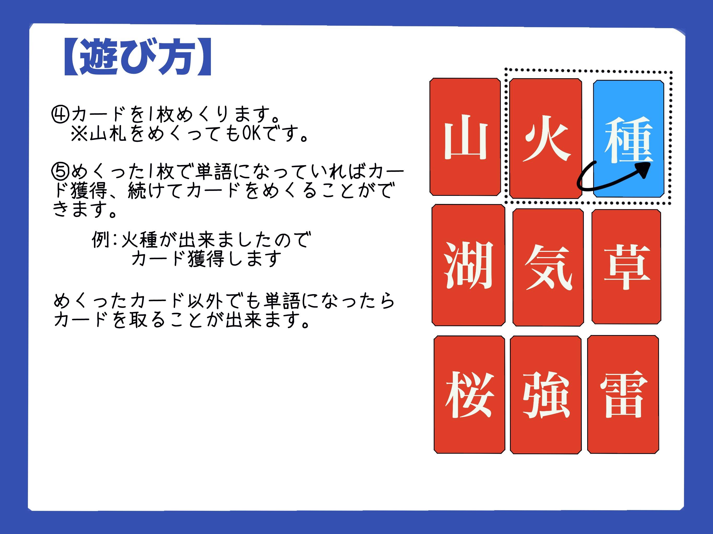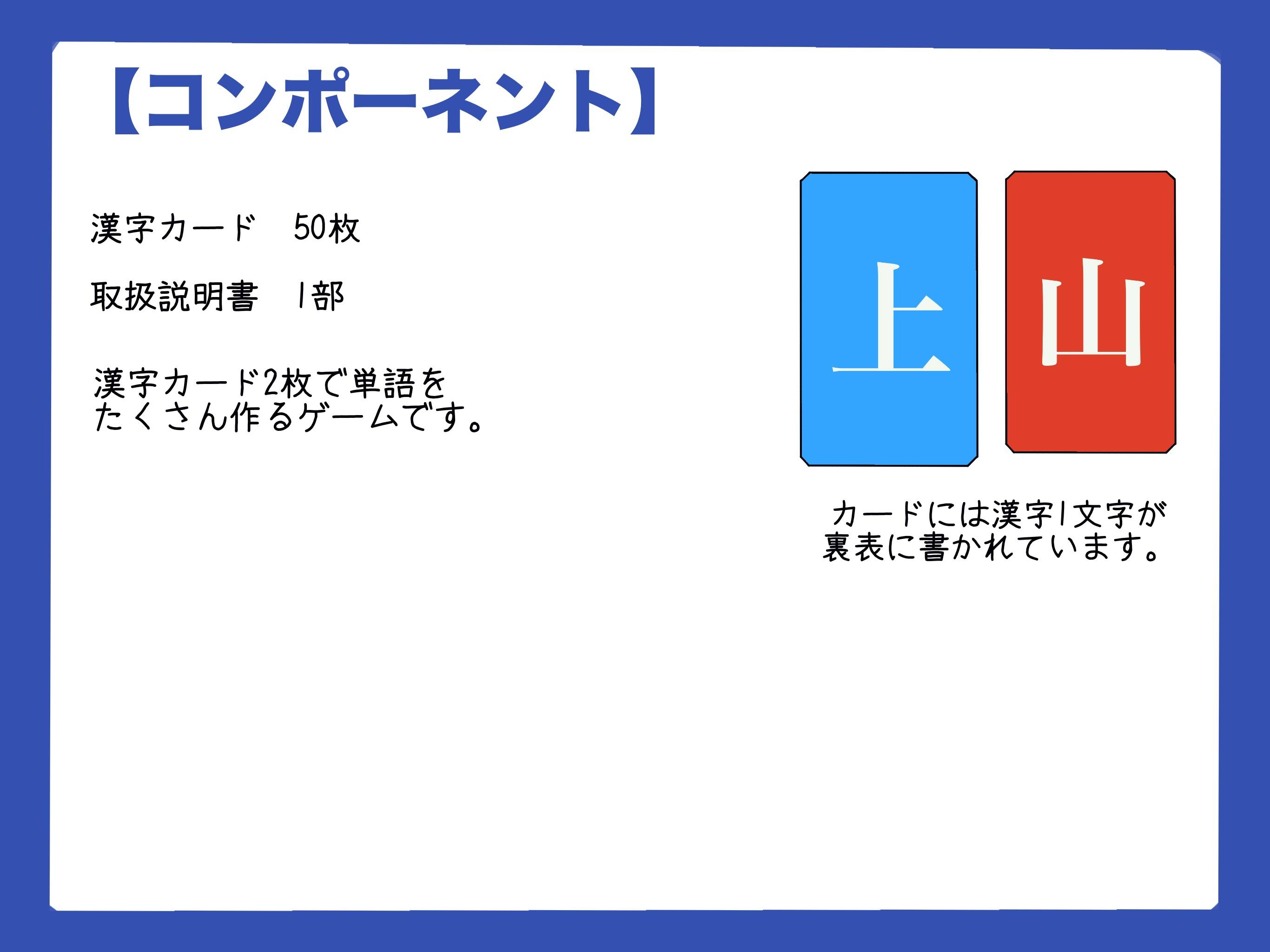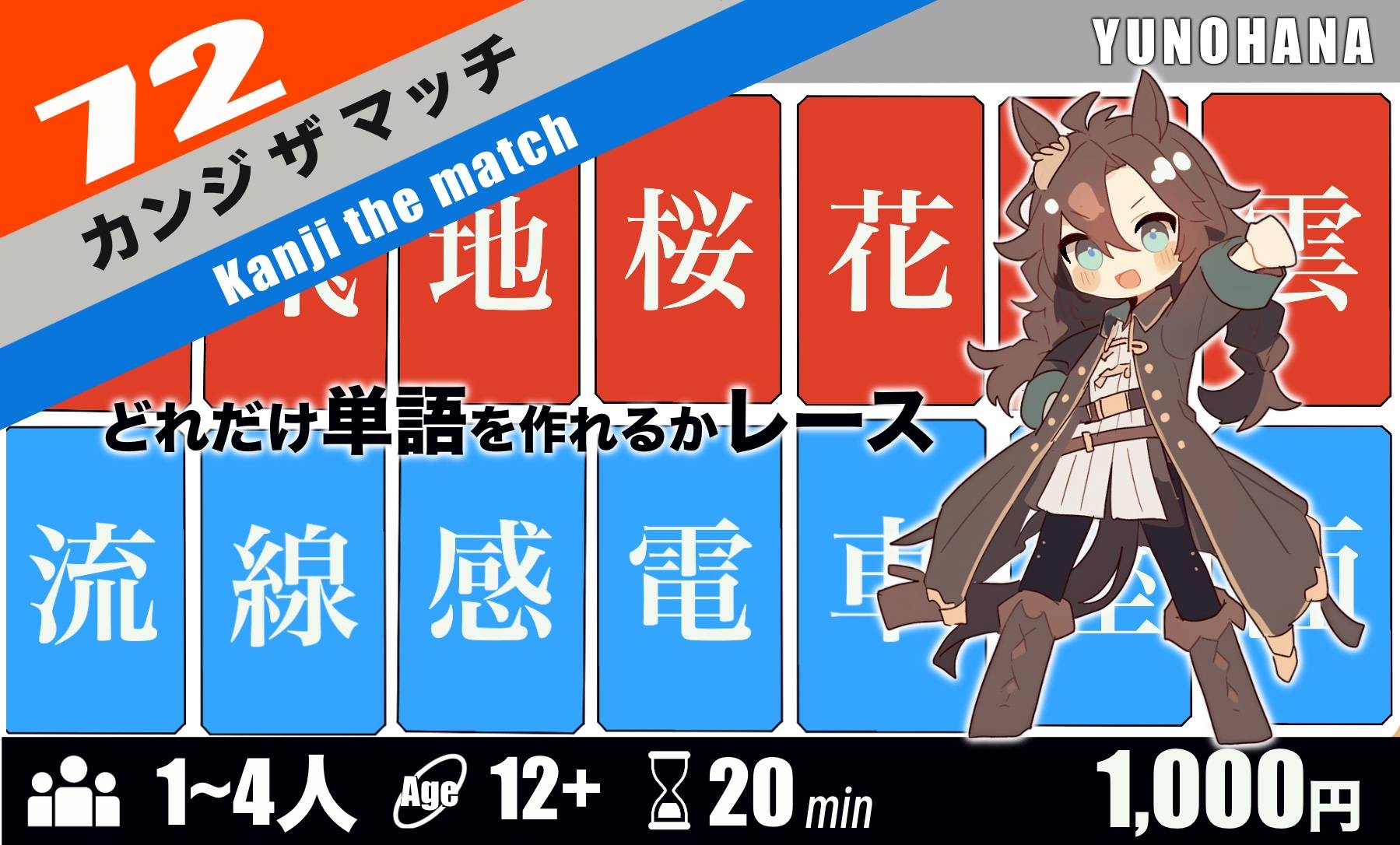 2025秋 両 - K62 2025春 両 - J21 yunohana @yunohana110 1-4 20- 12歳〜 カンジ サ マッチ ¥1,000 漢字と漢字を組み合わせて、できるだけ単語をいっぱい作るカードゲーム! カンジ サ マッチ ゲーム概要 プレイ人数 1〜4人 プレイ時間20〜分 対象年齢12歳〜 価格1,000円 発売時期2025秋 予約 可 ゲームデザイン イラスト・DTP ゲーム詳細 この記事をシェア
