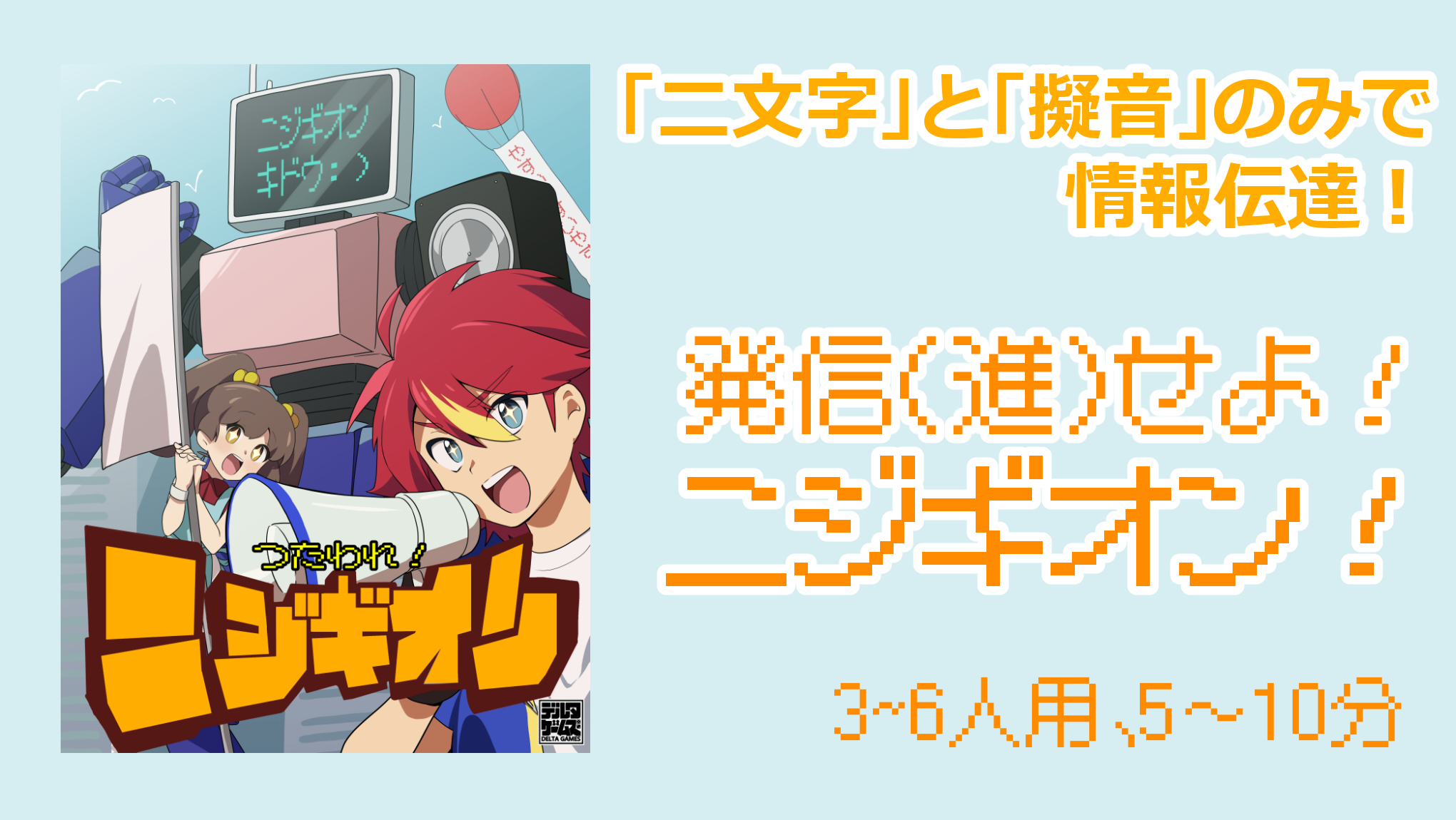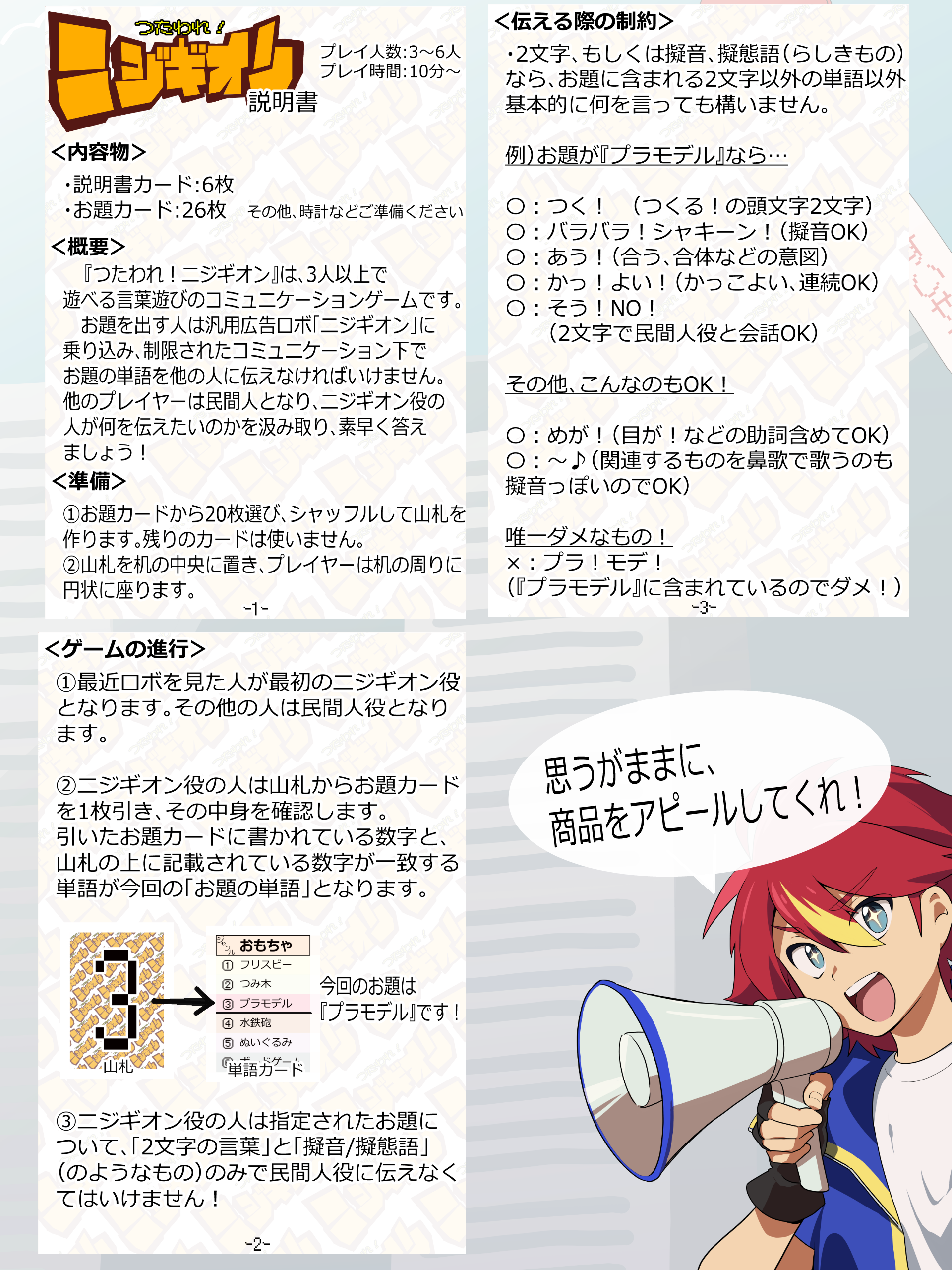 親のプレイヤーはニジギオン役となり、広告すべきお題の単語を「二文字までの言葉出力」と「擬音」だけで市民に伝えることを目標とします。
