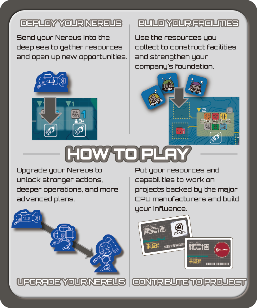 - 集めた資源はシェア争いの激しい半導体企業へ納品 して支援を得るか、自身の海底基地を建設して足場を固めるか舵をとり、この海の支配権獲得を目指します。