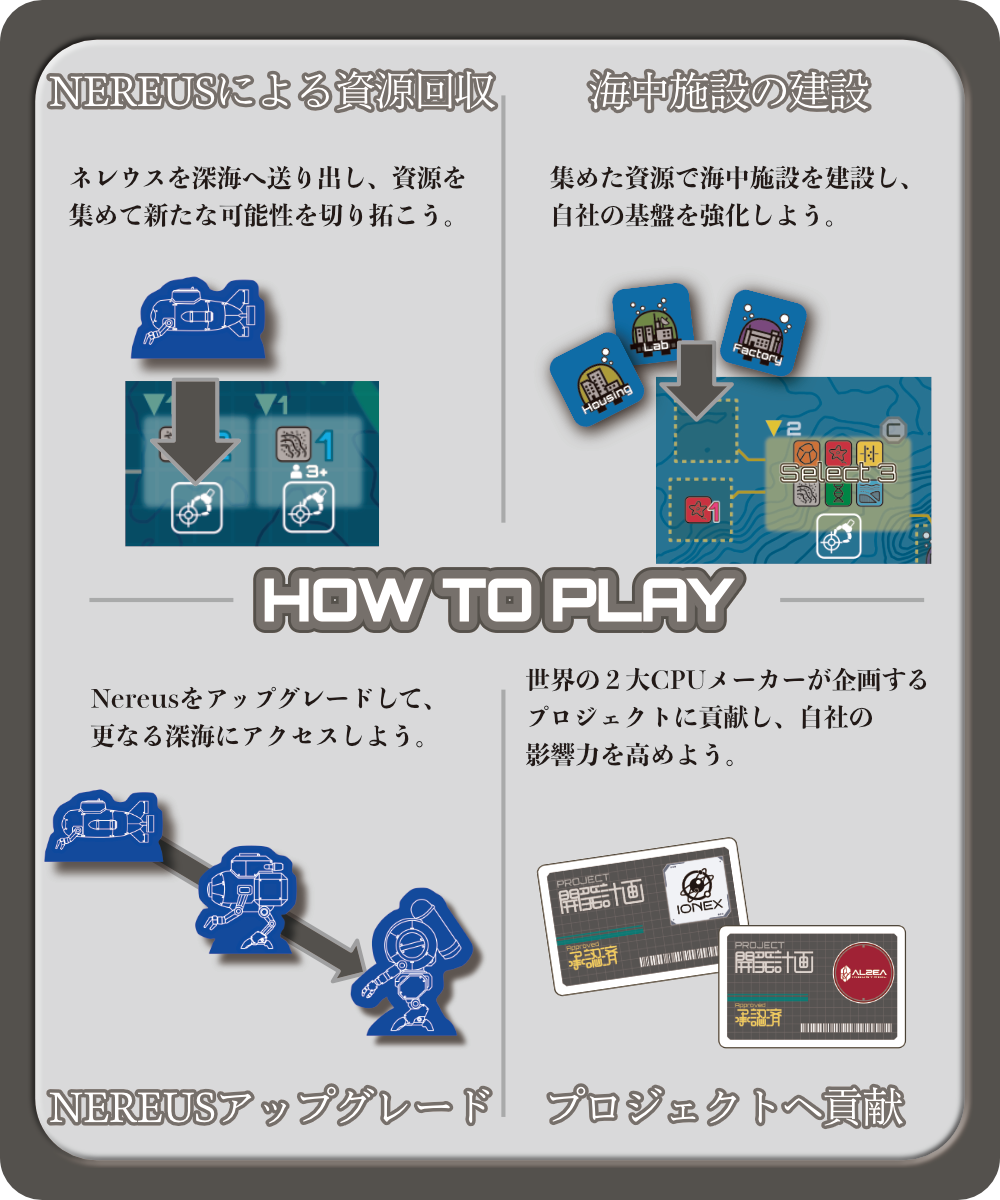 Nereus: Abyssal Blue(ネレウス:アビサルブルー)は、深海探査×拠点建設×シェア争いがテーマの戦略ゲームです。