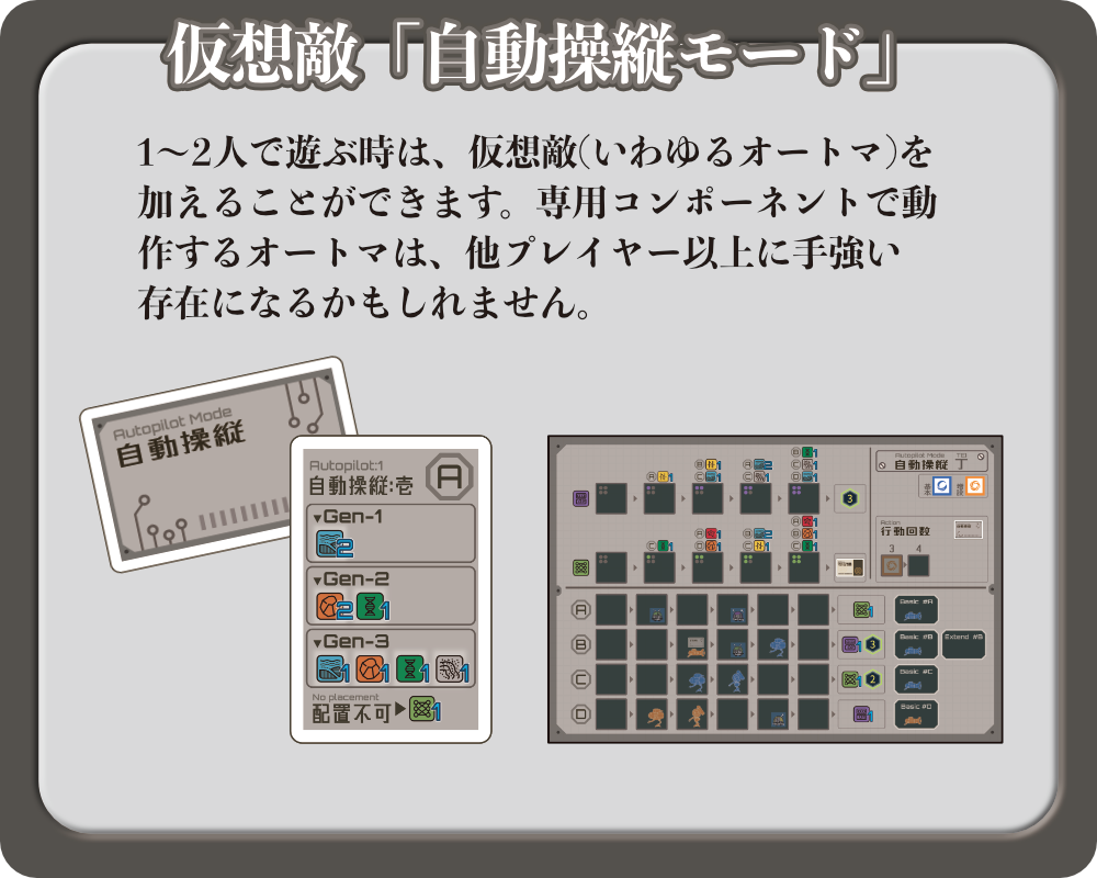 この「自動操縦」モードは専用カード・専用マットで動作し、プレイヤーの行動計画を先回りして苦しめようとします。