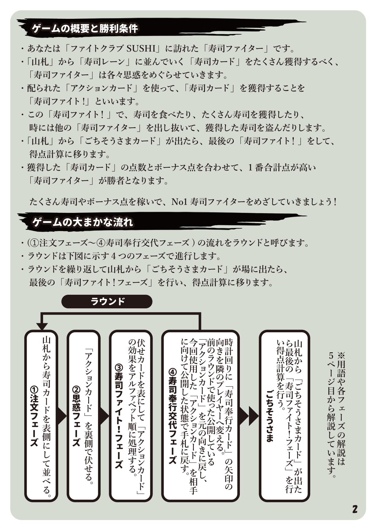 ・『寿司ファイト』は6枚のアクションカードを使い『寿司カード』を取り合うボードゲームです。