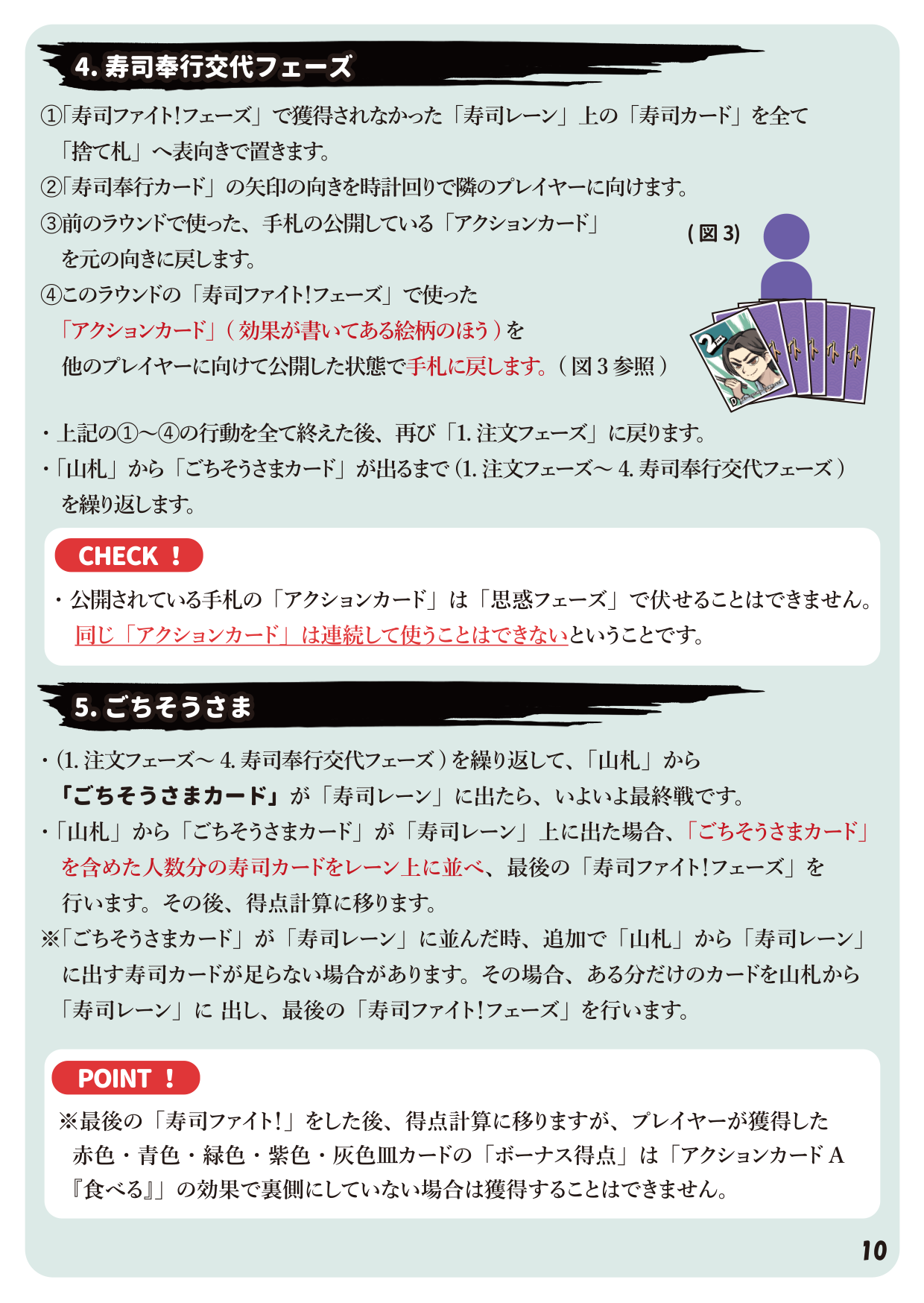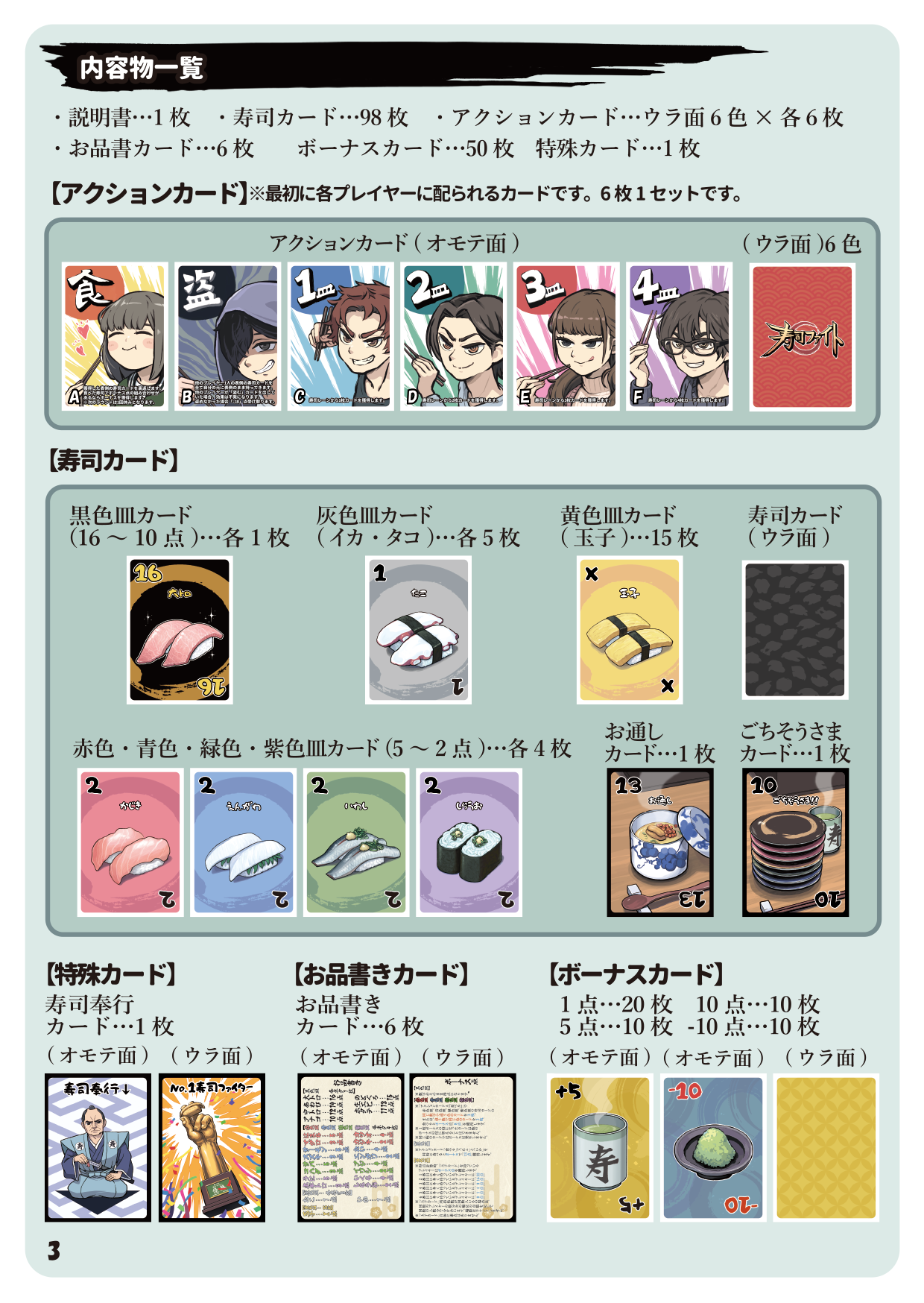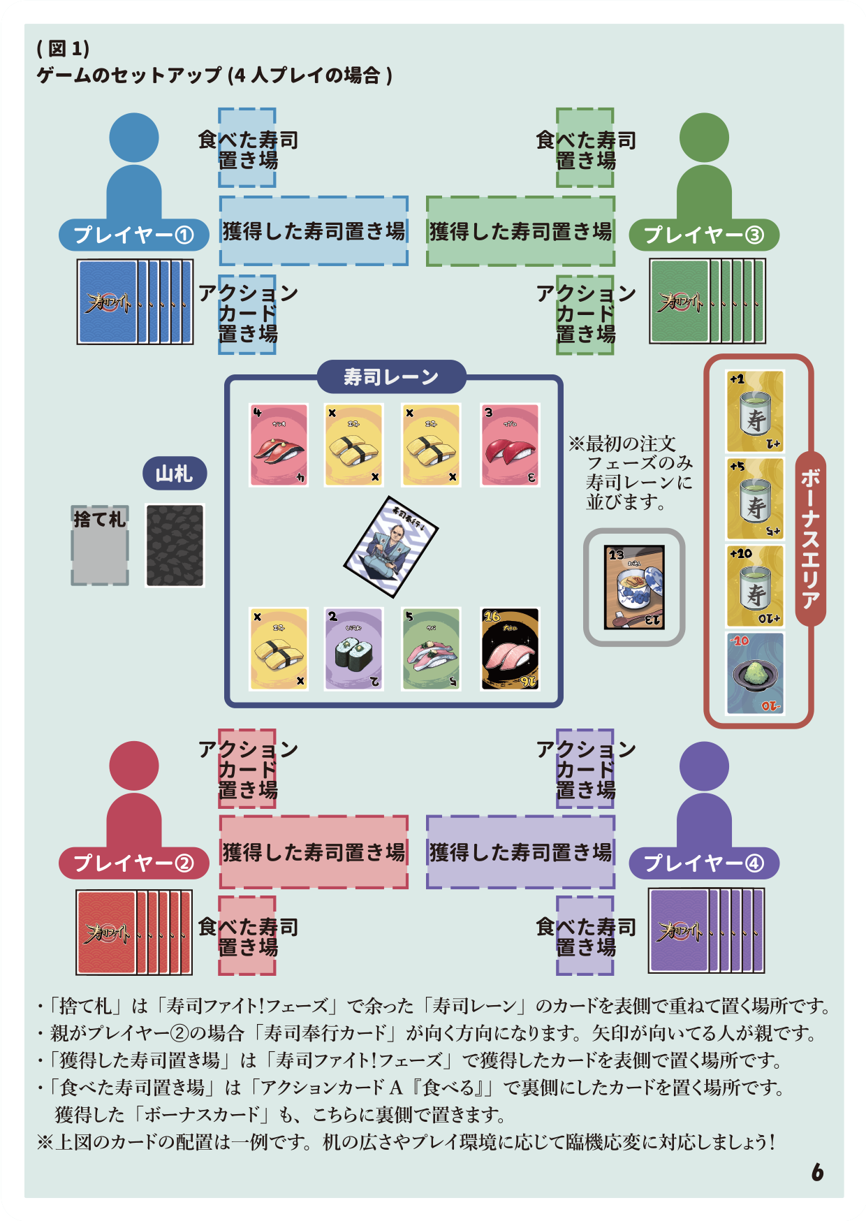- 6つのアクションカードを使い、流れてくる寿司を取り合うボードゲーム!