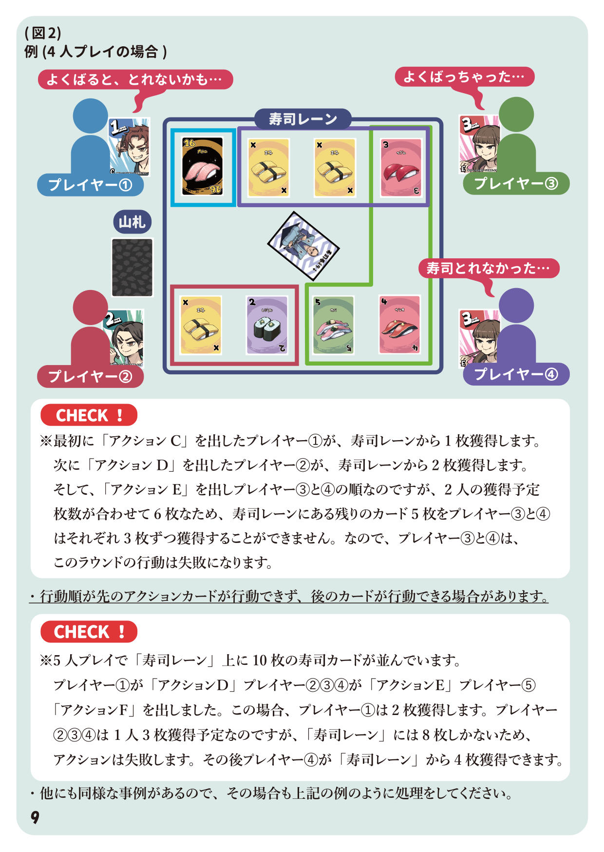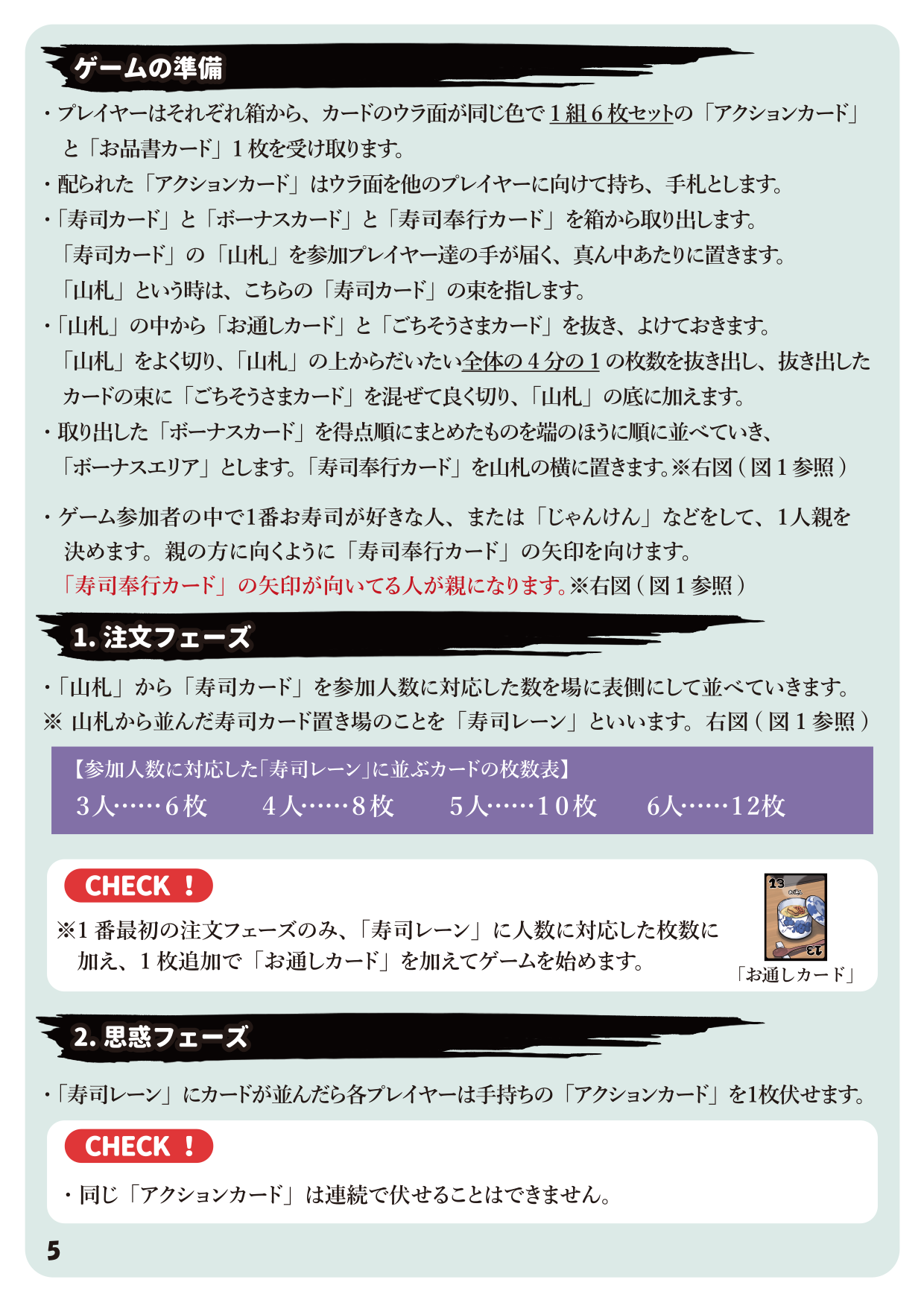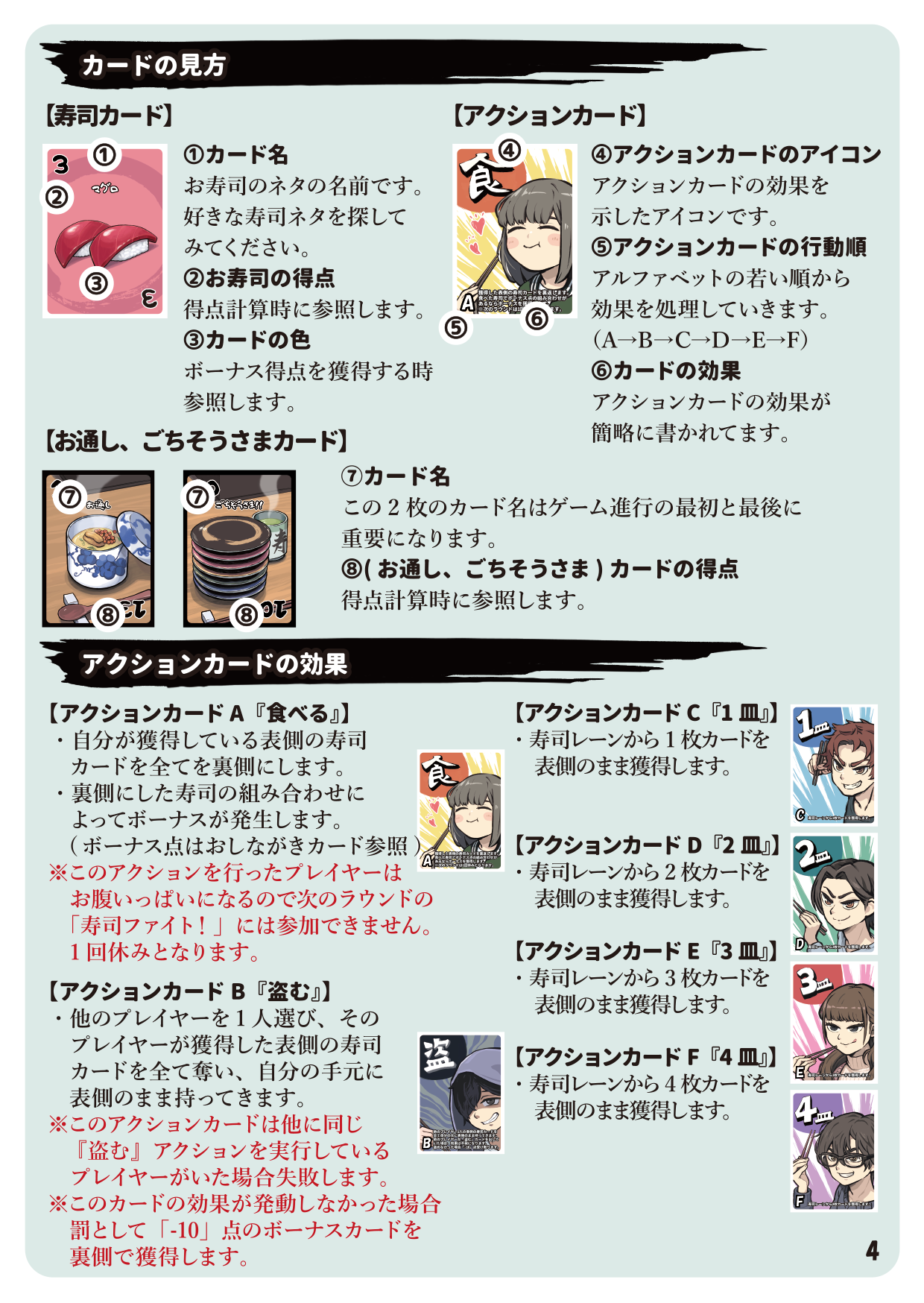 ・アクションカードは『食べる』『盗む』『1皿』『2皿』『3皿』『4皿』『5皿』あり、表になったカードが狙う寿司の数が寿司レーンに残ってないと取れないです。