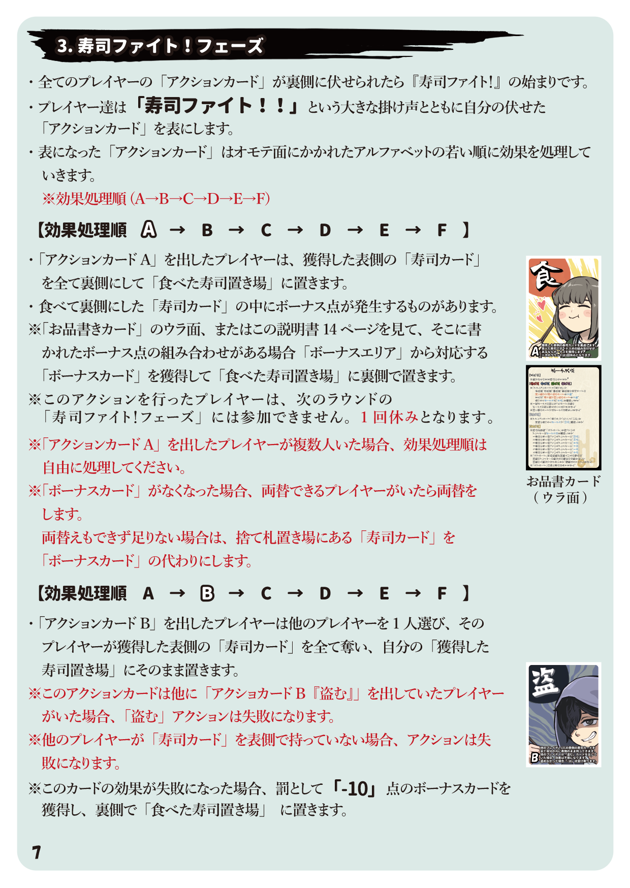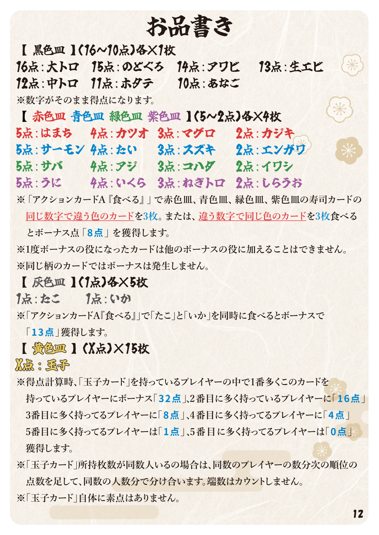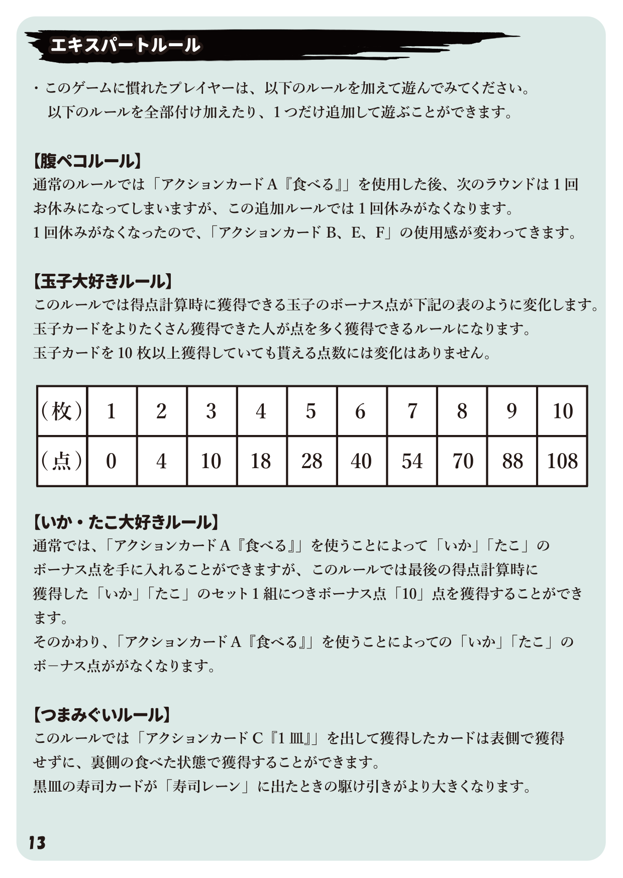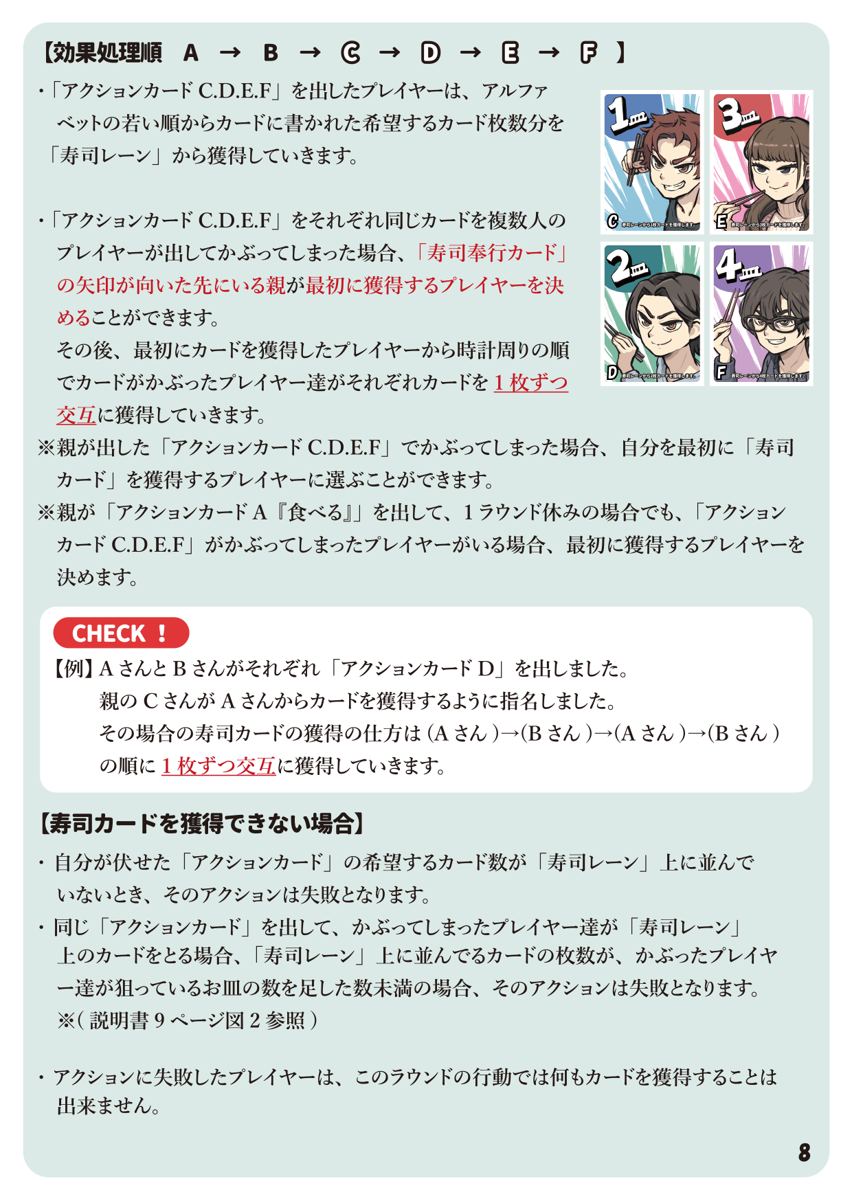 ・アクションカードは『食べる』『盗む』『1皿』『2皿』『3皿』『4皿』『5皿』あり、表になったカードが狙う寿司の数が寿司レーンに残ってないと取れないです。
