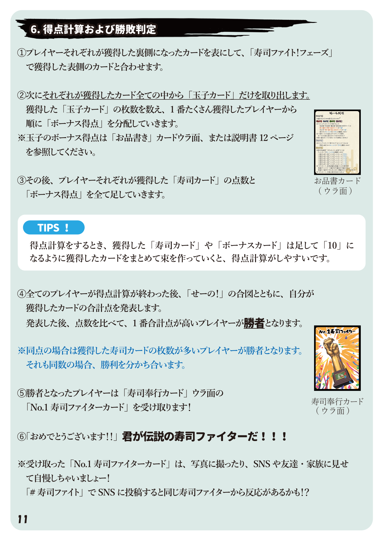・この寿司ファイトを繰り返し、一番お寿司の点数をたくさんとった人が勝者となります。