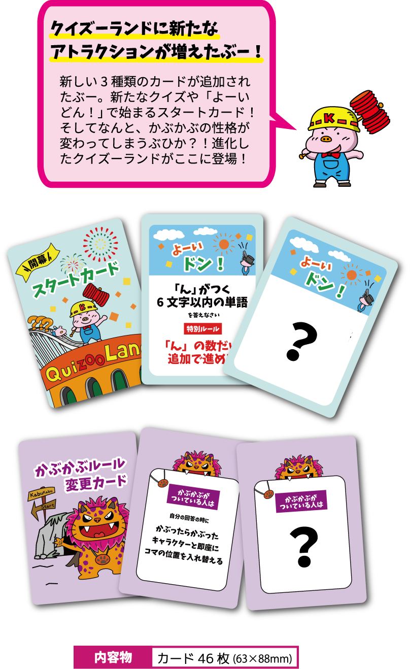 新しいクイズカードと、開幕スタートカード、かぶかぶルール変更カードなどが加わった拡張カードが登場!