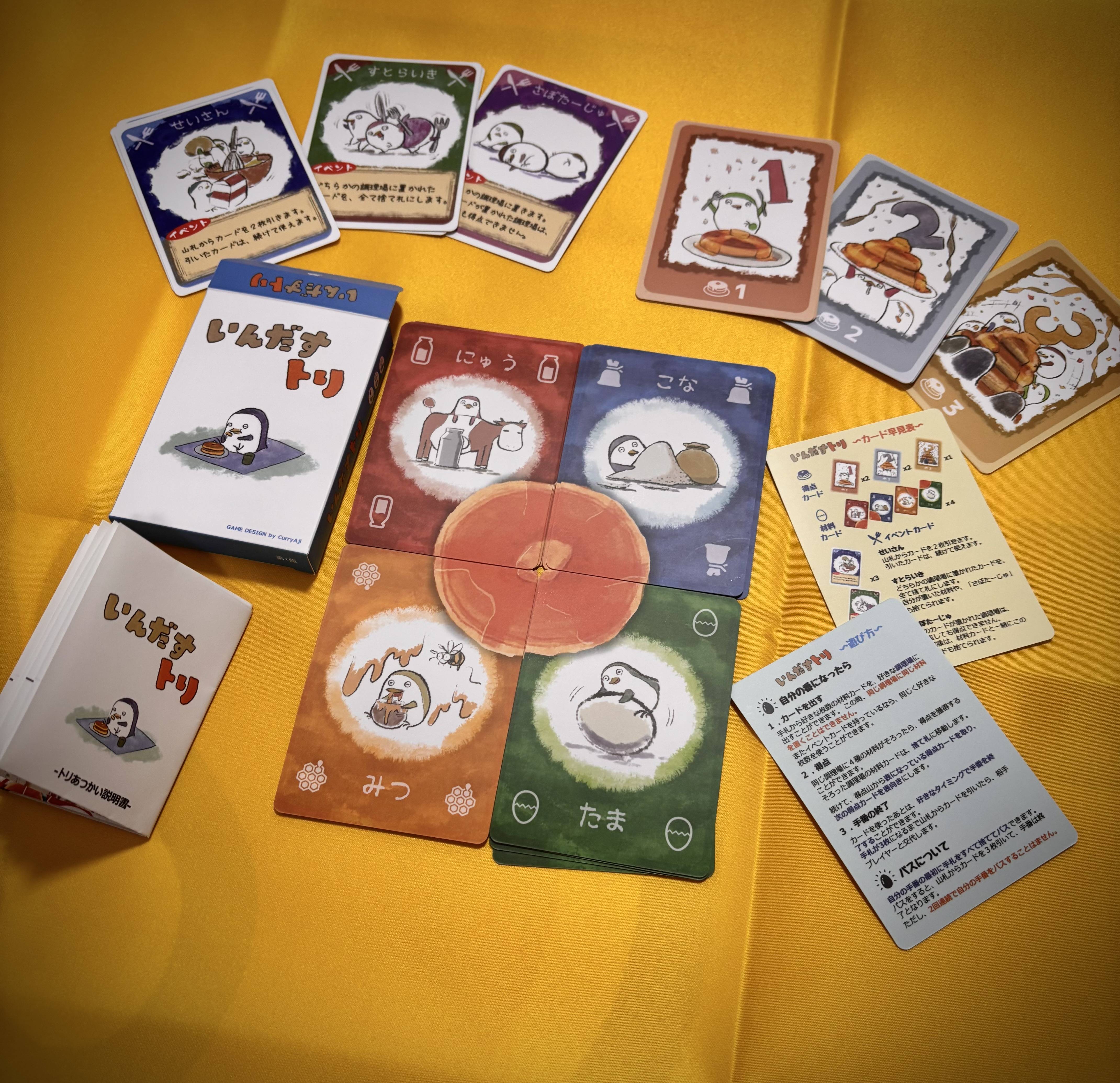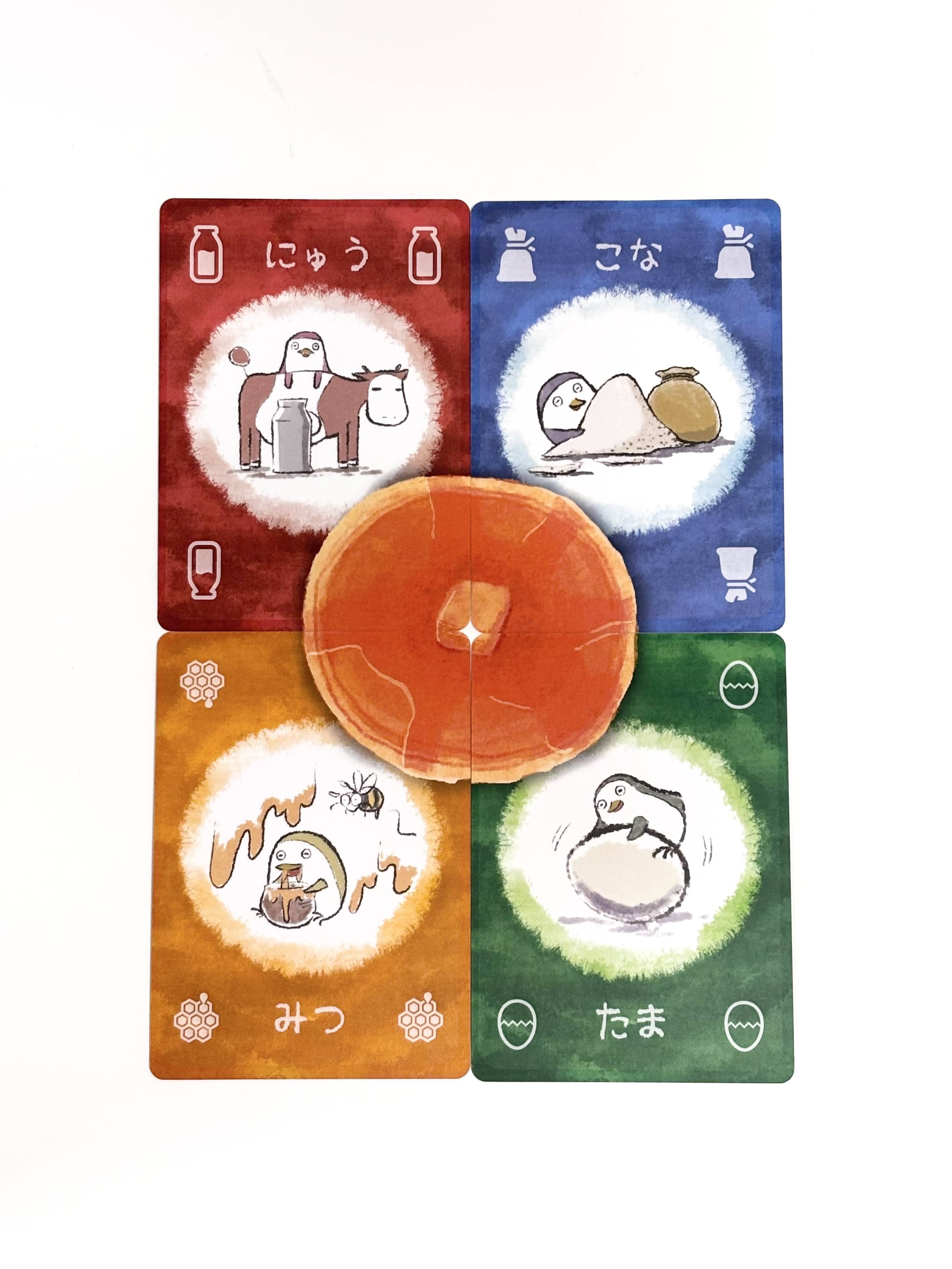 • 4種の材料カードを2つの調理場に出し合い、先にホットケーキを完成させよう! 手札は3枚、何枚使ってもOK! でも出しすぎは相手に横取りされるかも!? 得点は毎回変化、5点先取の読み合いバトルです!