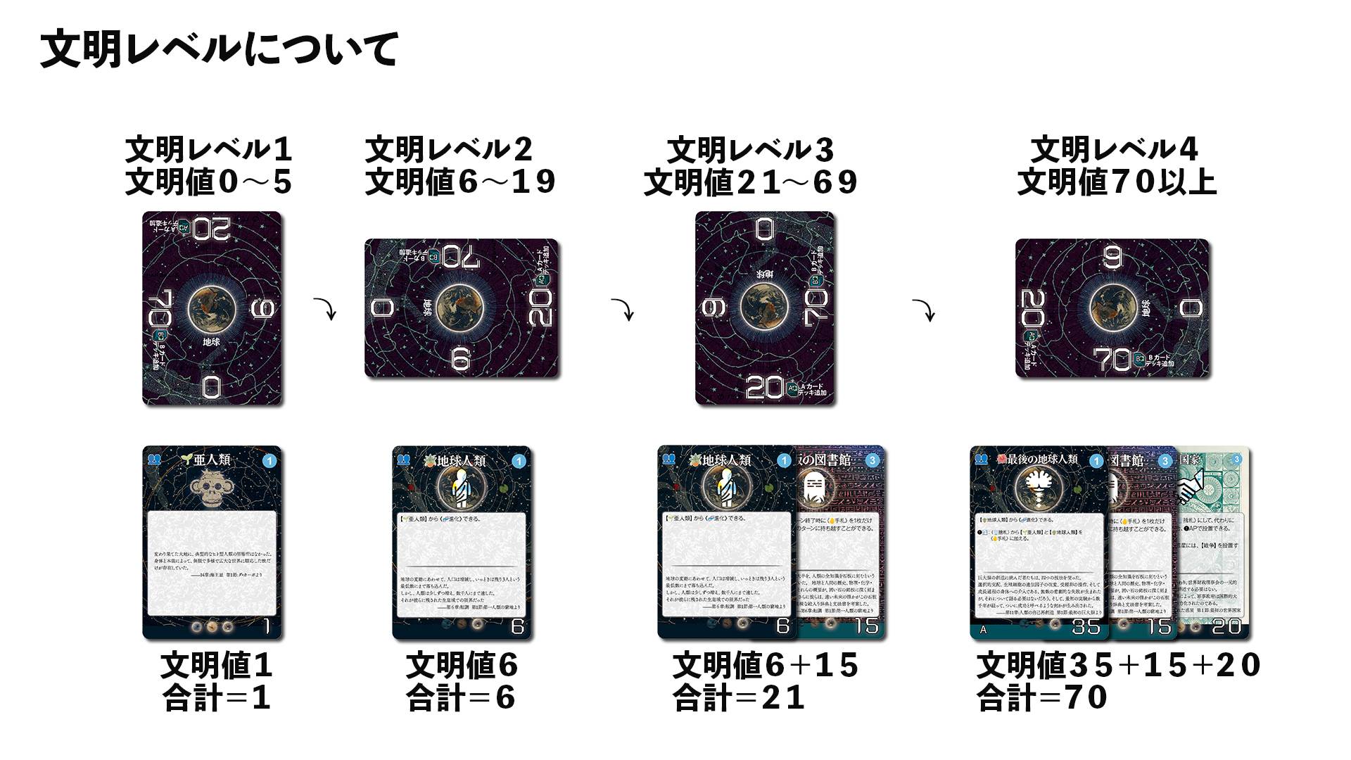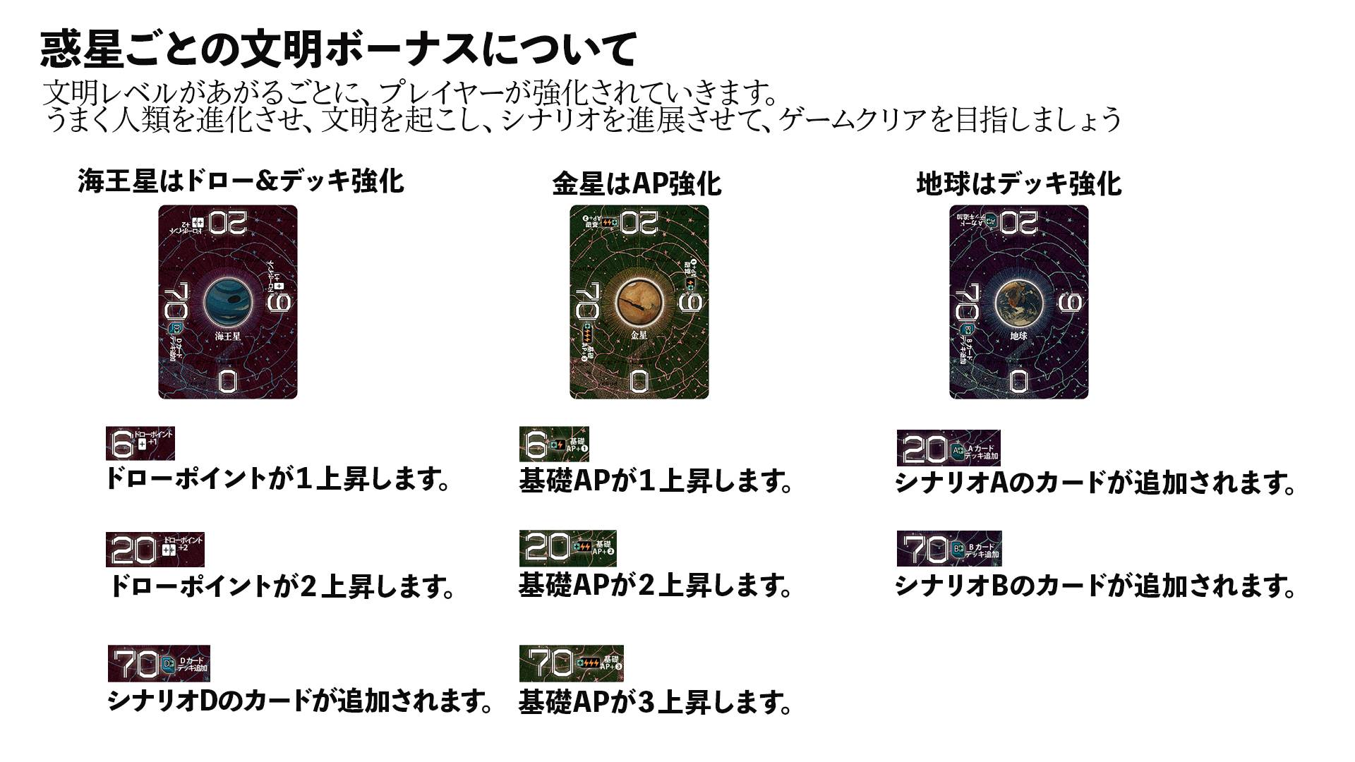『地球』、『金星』、『海王星』の3種類の惑星があり、それぞれレベル1〜4の文明レベルがあり、惑星におかれたカードの文明値の合計によって上昇します。