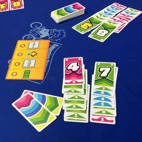 各プレイヤーは8枚の手札を持ってスタートし、カードは3色、1~9の値で構成されます。